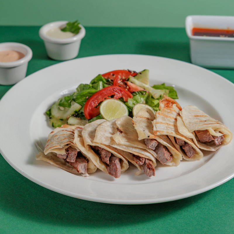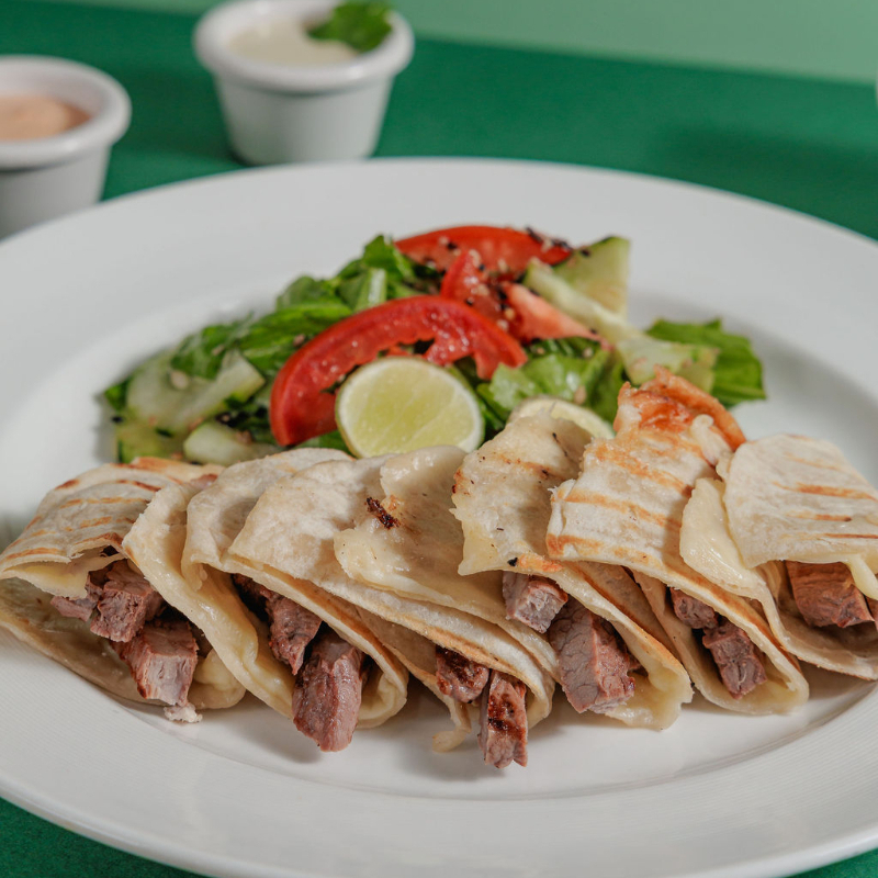 200 gr de jugosa carne de res, dividido en 3 quesadillas en tortilla de harina, gratinadas con queso gouda y acompañadas con ensalada de la casa.