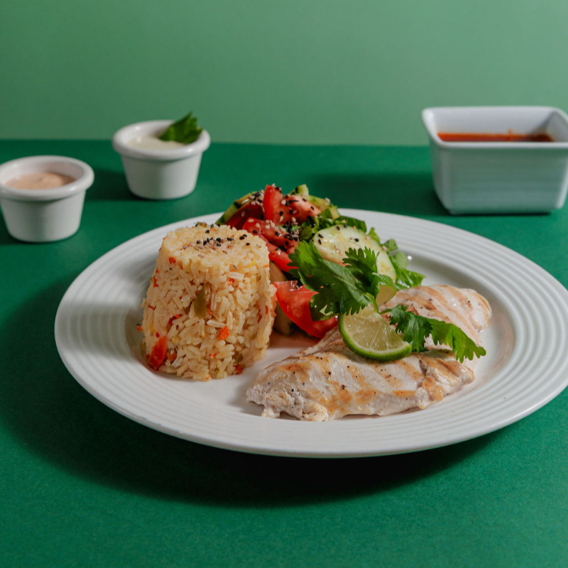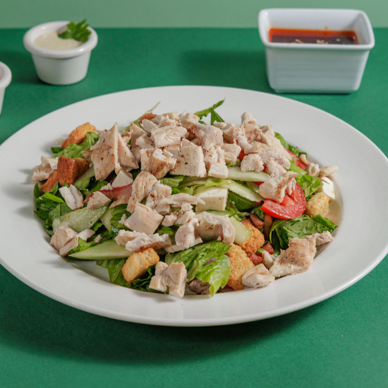 Base de lechuga, pechuga de pollo a la plancha, panela, pepino, jitomate, crotones y vinagreta de la casa.