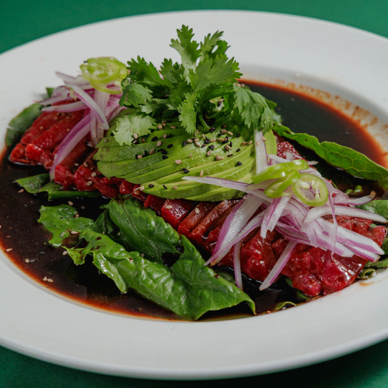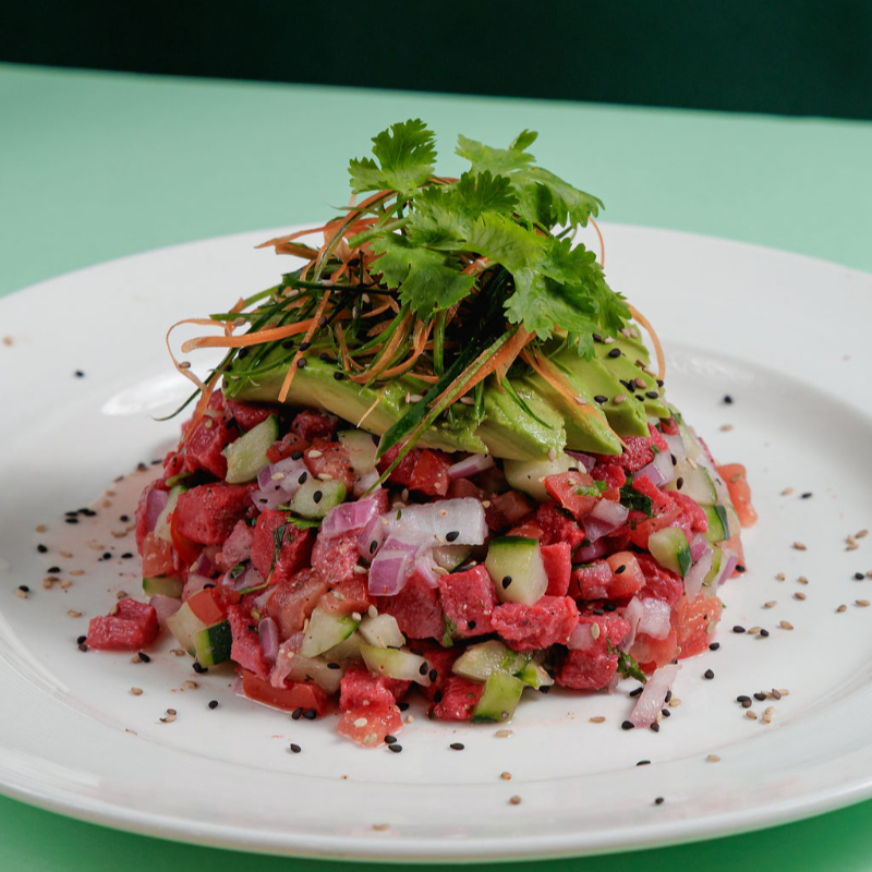 Atún fresco rebanado y montado sobre una cama de lechuga, bañado en nuestra salsa especial para sashimi, chile serrano y aguacate. Acompañado de tostadas marisqueras y galletas saladitas.