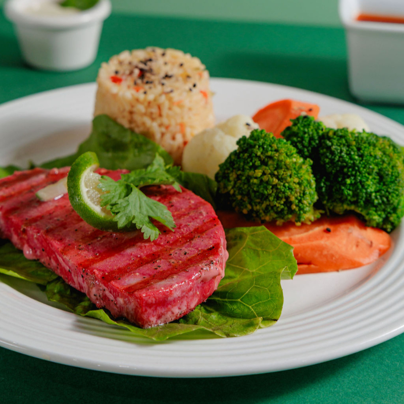 Medallón de atún fresco, sazonado, sellado a la plancha, acompañado de 2 guarniciones a elegir.