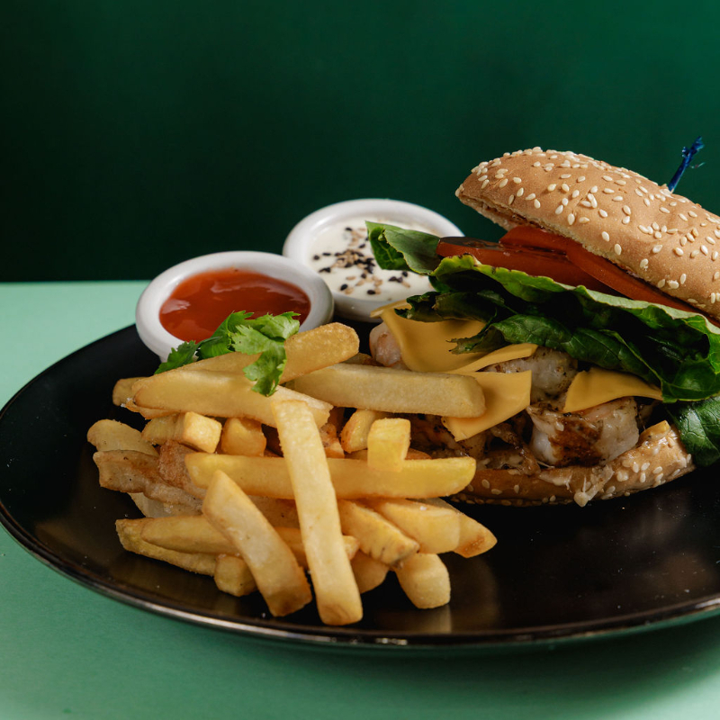 Camarón gratinado en queso gouda, en pan de ajonjolí, mayonesa, queso amarillo, lechuga, jitomate y cebolla morada. Acompañada de 1 guarnición a elegir.