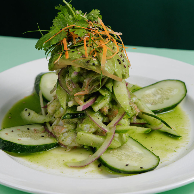 Camarón curtido con limón en salsa verde de la casa, pepino, cebolla morada y aguacate. Acompañado de tostadas marisqueras y galletas saladitas.