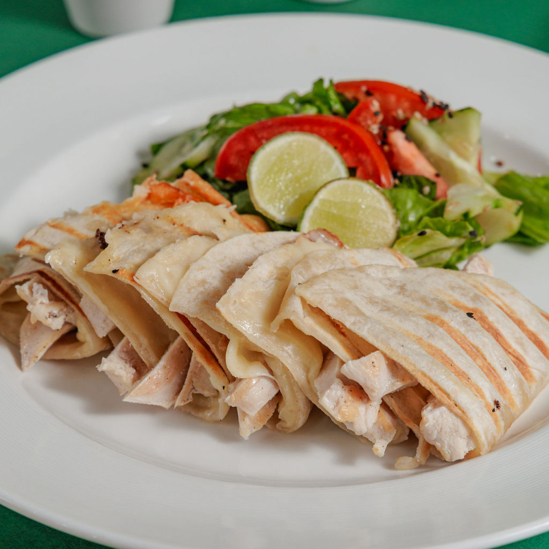 200 gr de jugoso pollo, dividido en 3 quesadillas en tortilla de harina, gratinadas con queso gouda y acompañadas con ensalada de la casa.
