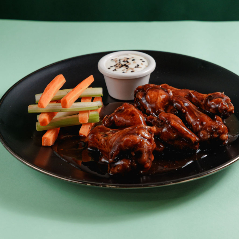 350 gr de alitas bañadas en la salsa de tu elección, incluye aderezo ranch y verdura.