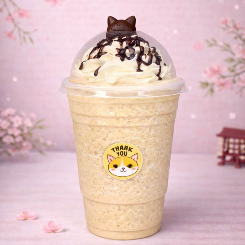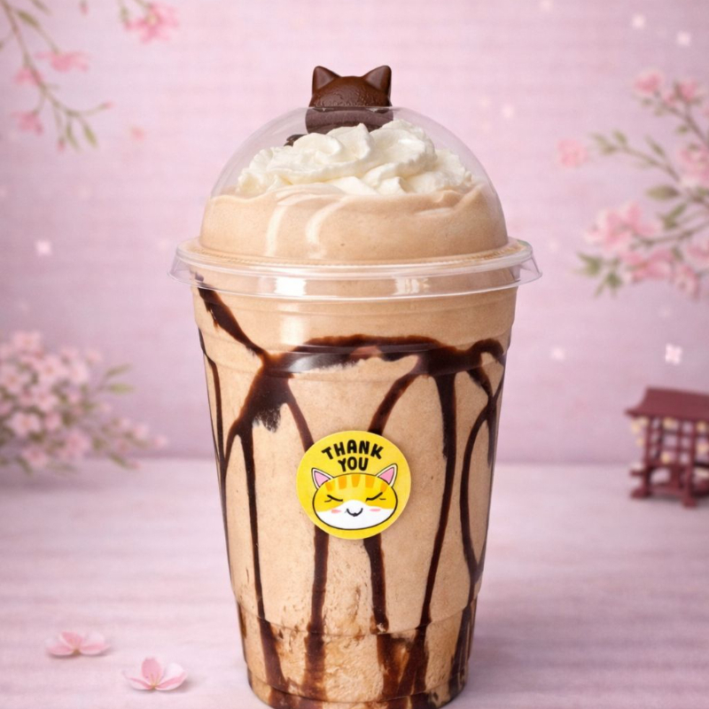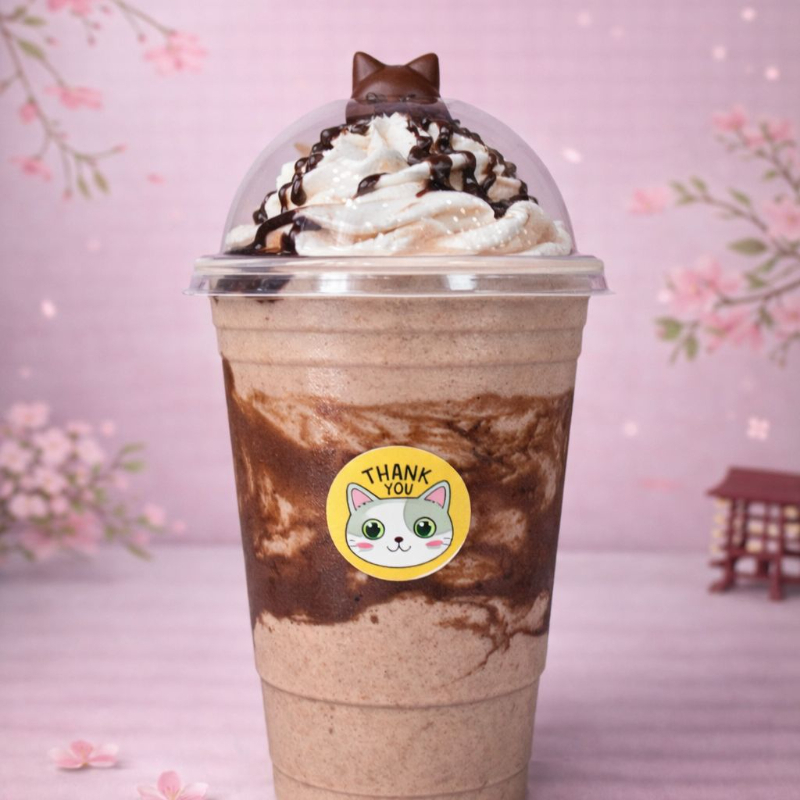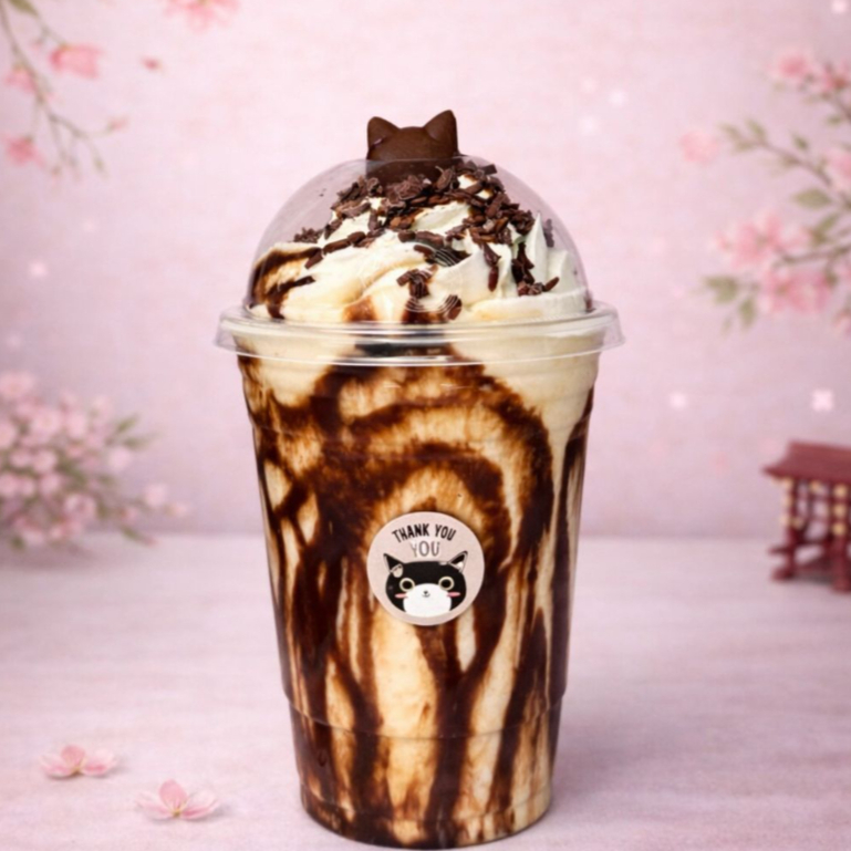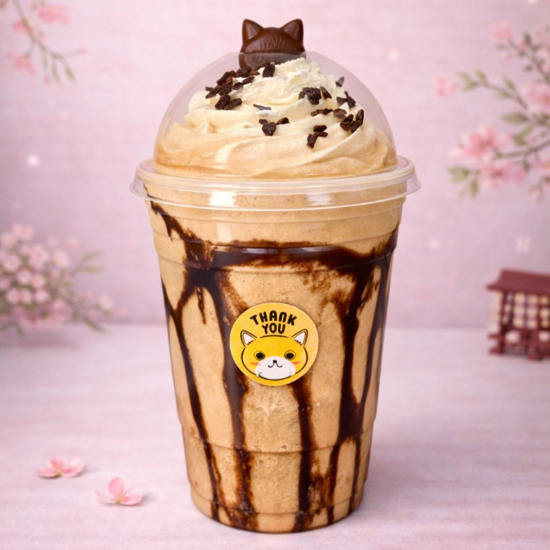 Delicioso y cremoso Frappuccino de moka ,shot de espresso recien molido, chocolate amargo y base de cafe con chocolate , leche deslactosada , y escencia de chocolate de lacasa , decorado con crema batida , jarabe de chocolate hersheys y medallitas de chocolate de la casa