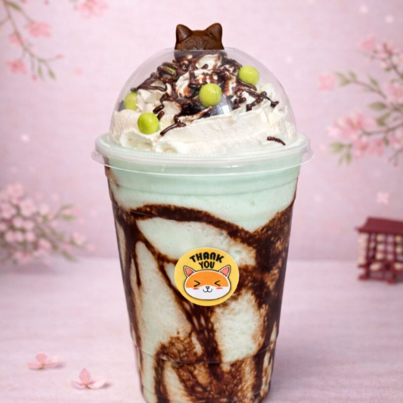 Delicioso y refrescante Frappuccino de chocomenta, frappeado con crema de menta y chocolate blanco , chocoretas , medio shot de cafe recien molido , leche deslactosada y acompañado con jarabe de chocolate.