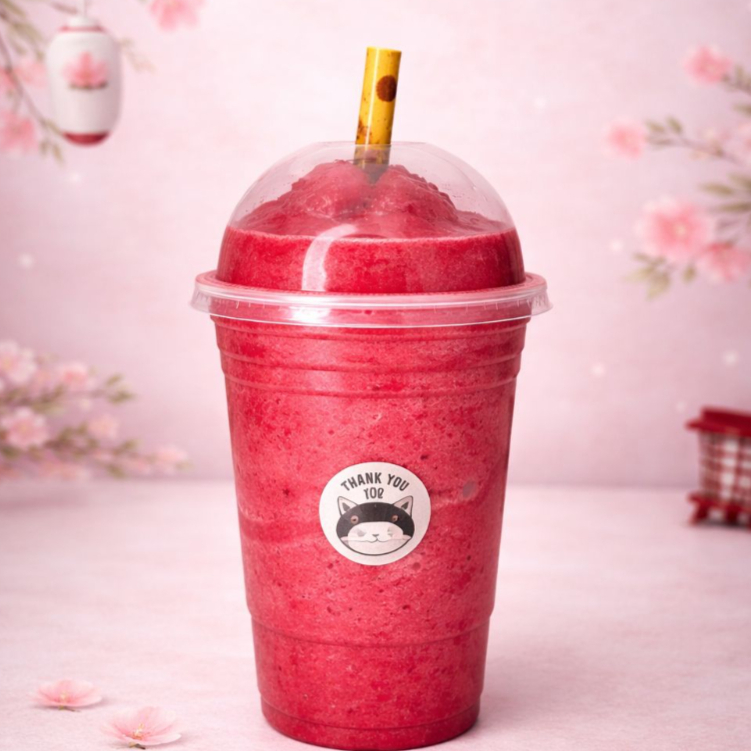 Refrescante Smoothie de fresa 100% natural frappeado con un poco de jugo de naranja , escarchado con chamoy , miguelito acompañado de gomitas a elegir y banderilla de tamarindo