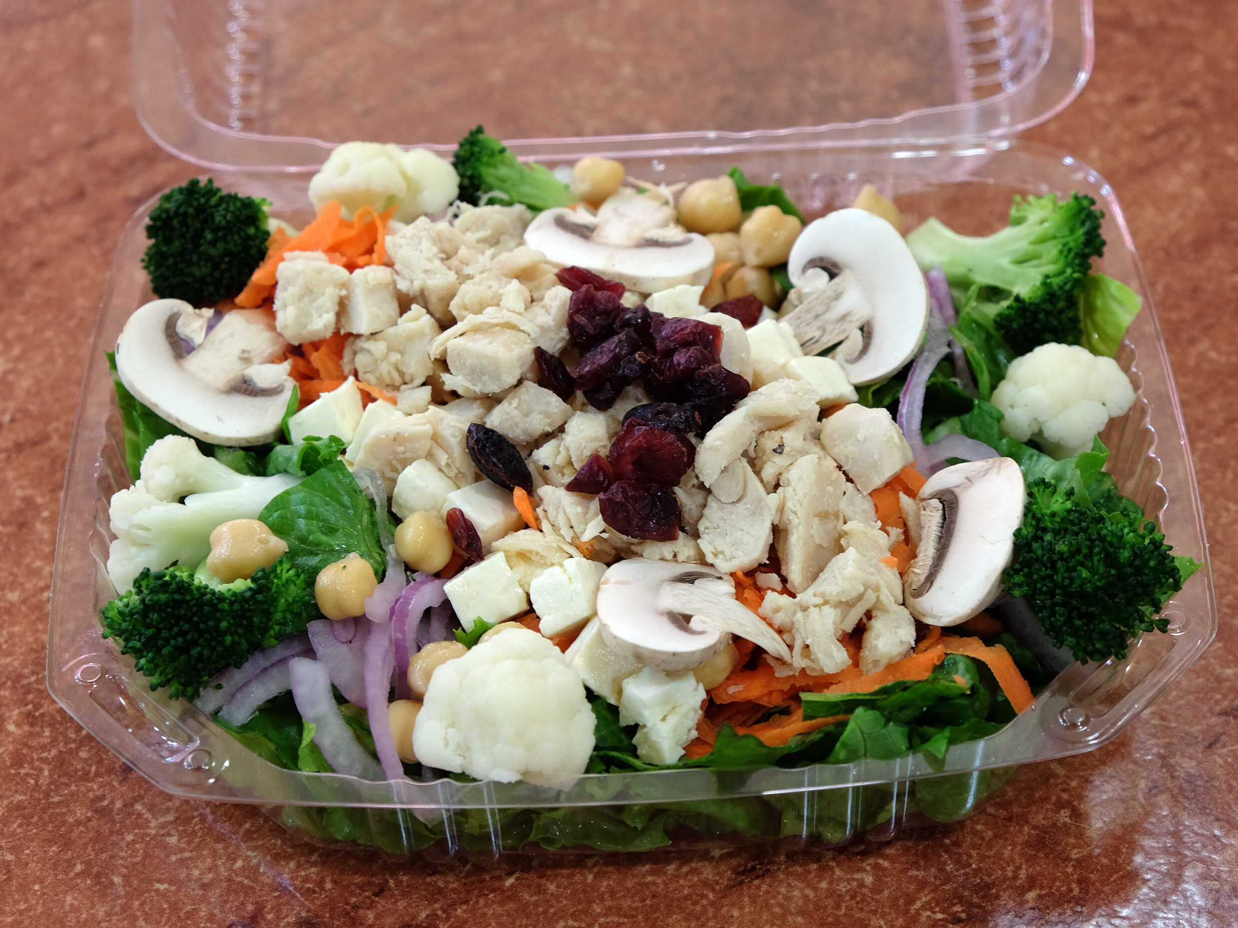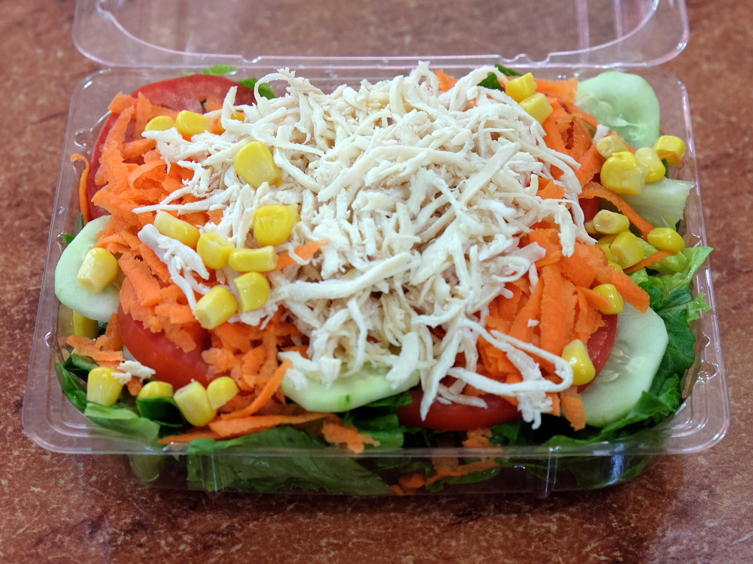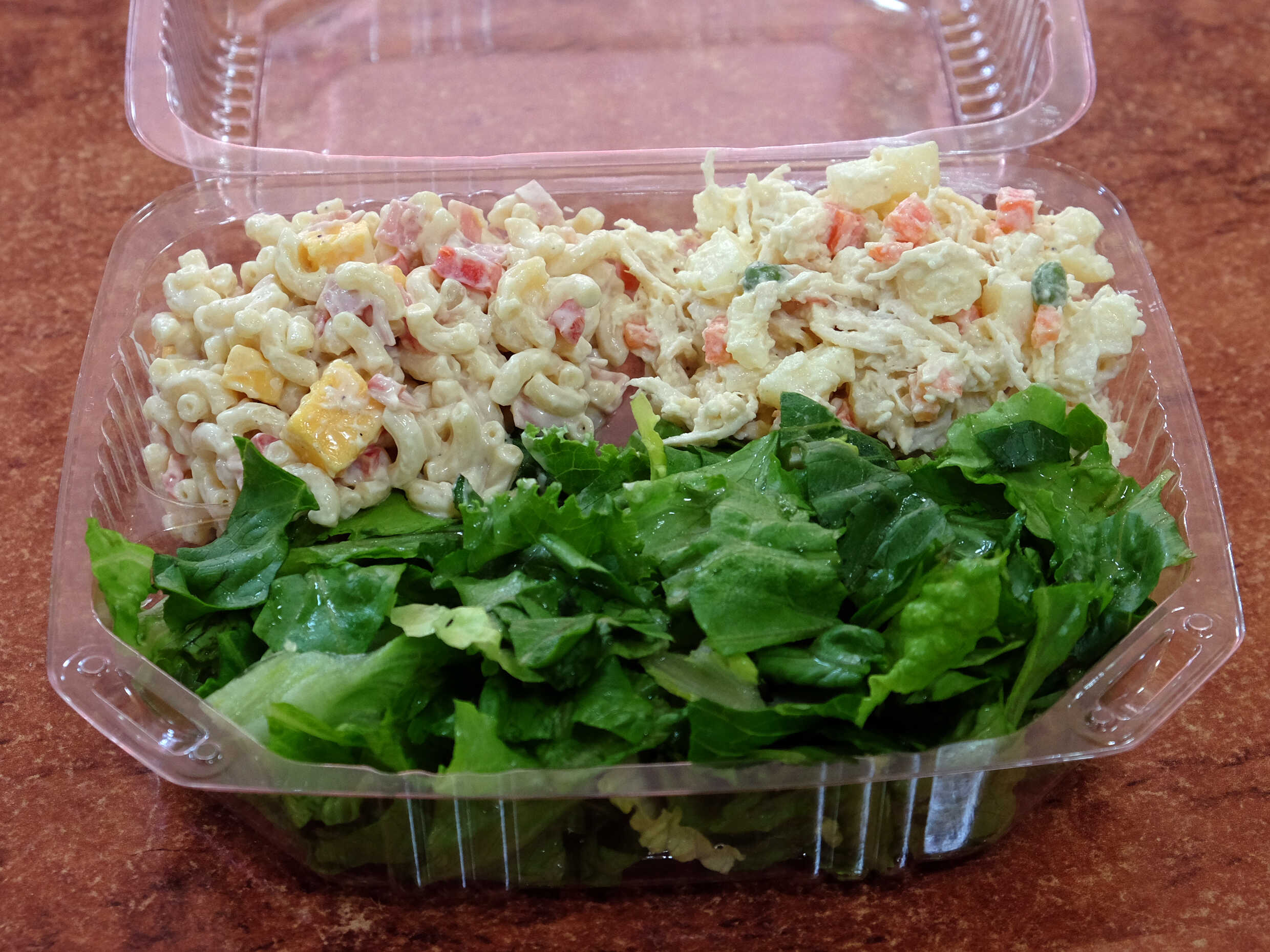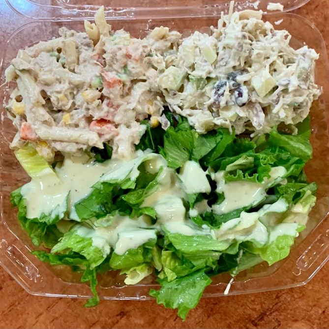 Lechuga, 1 ensalada de pollo o atún y 1 ensalada de pasta de coditos.