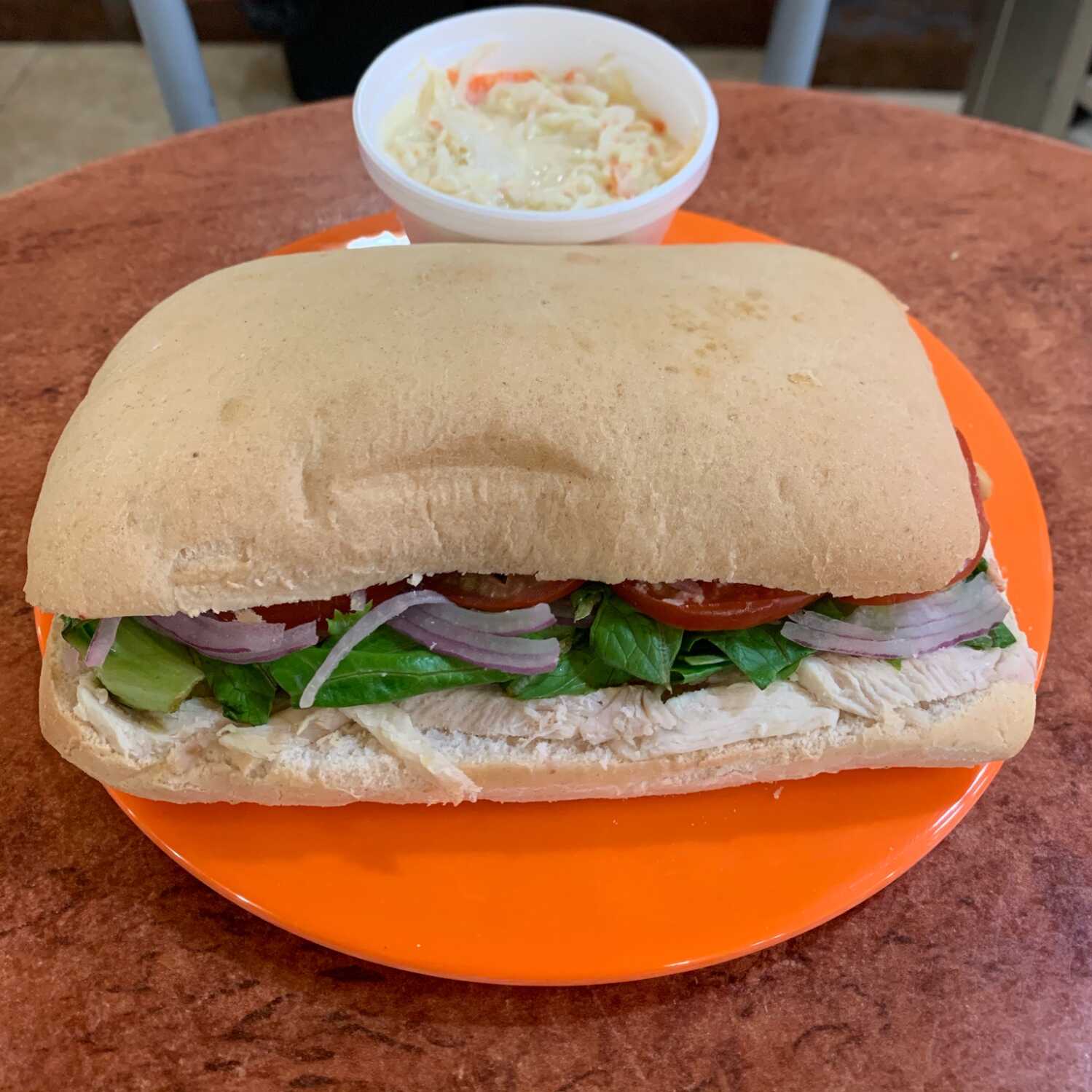 Torta de filete de pollo a la parrilla acompañada de 6 Oz de ensalada de col con zanahoria.