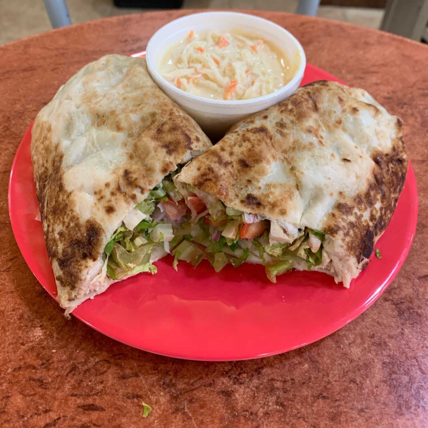 Tortilla de harina, fajitas de pollo, lechuga, jitomate, cebolla y aderezo de la casa.