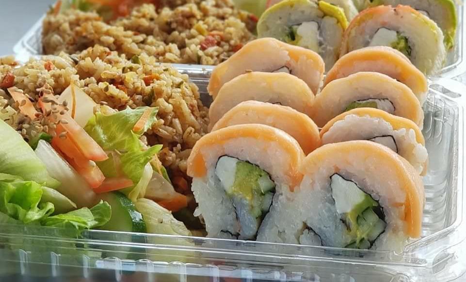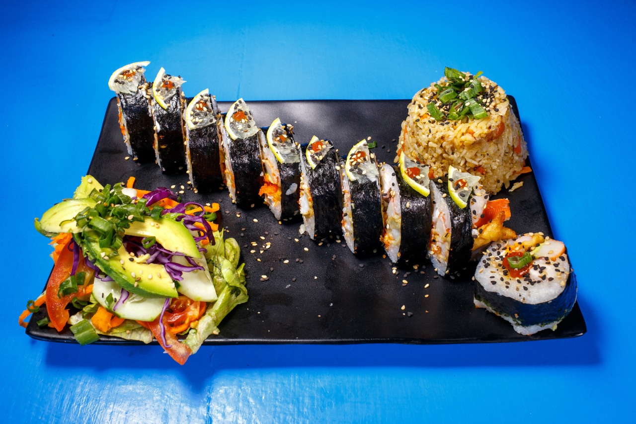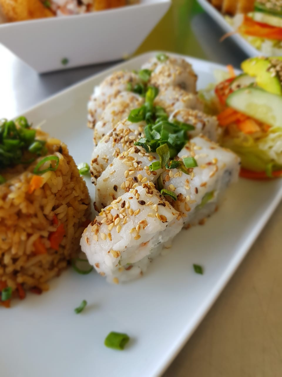 Sushi relleno de alga, queso philadelphia, pepino, aguacate, camarón y ajonjolí por fuera. Incluye arroz frito y ensalada fresca como guarnición.