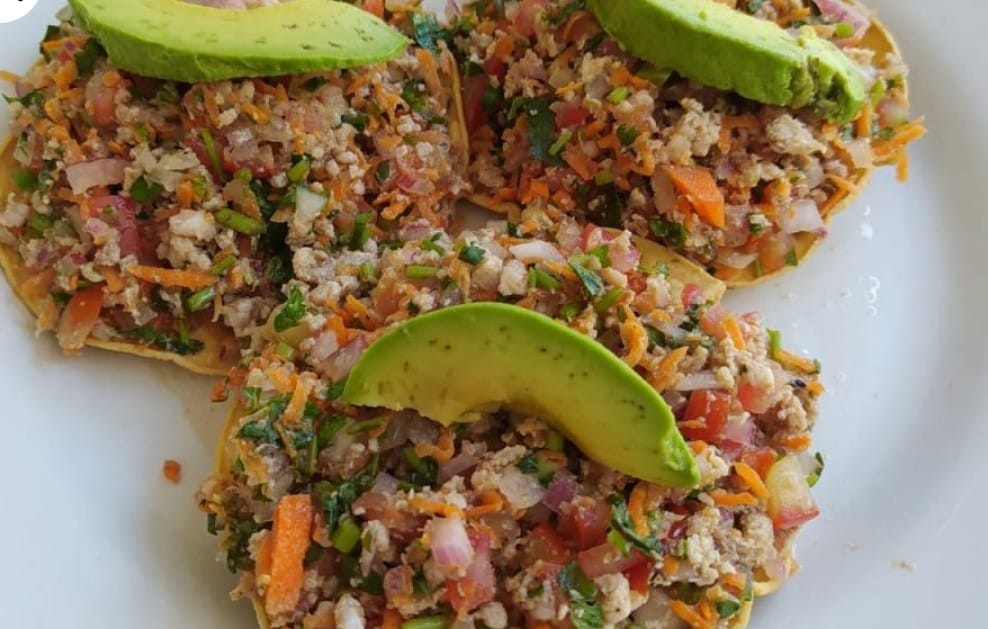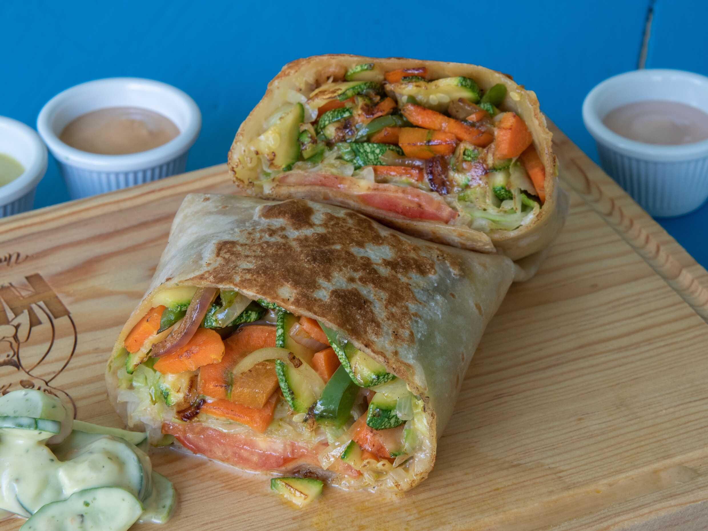 Tortilla de harina gigante rellena de vegetales salteados, queso gouda, aguacate, lechuga, jitomate, cebolla, aderezo tipo ranch y salsa cátsup.