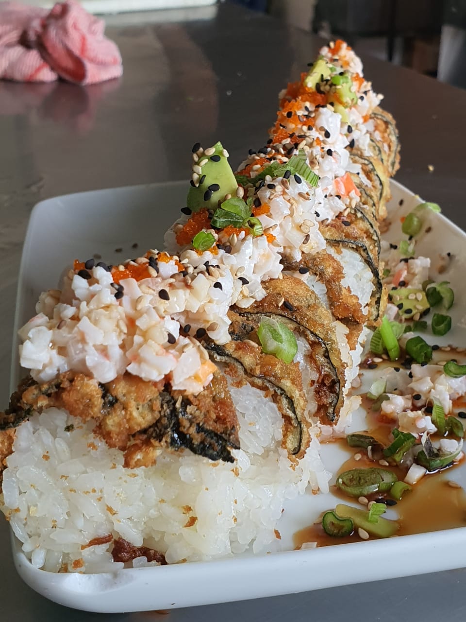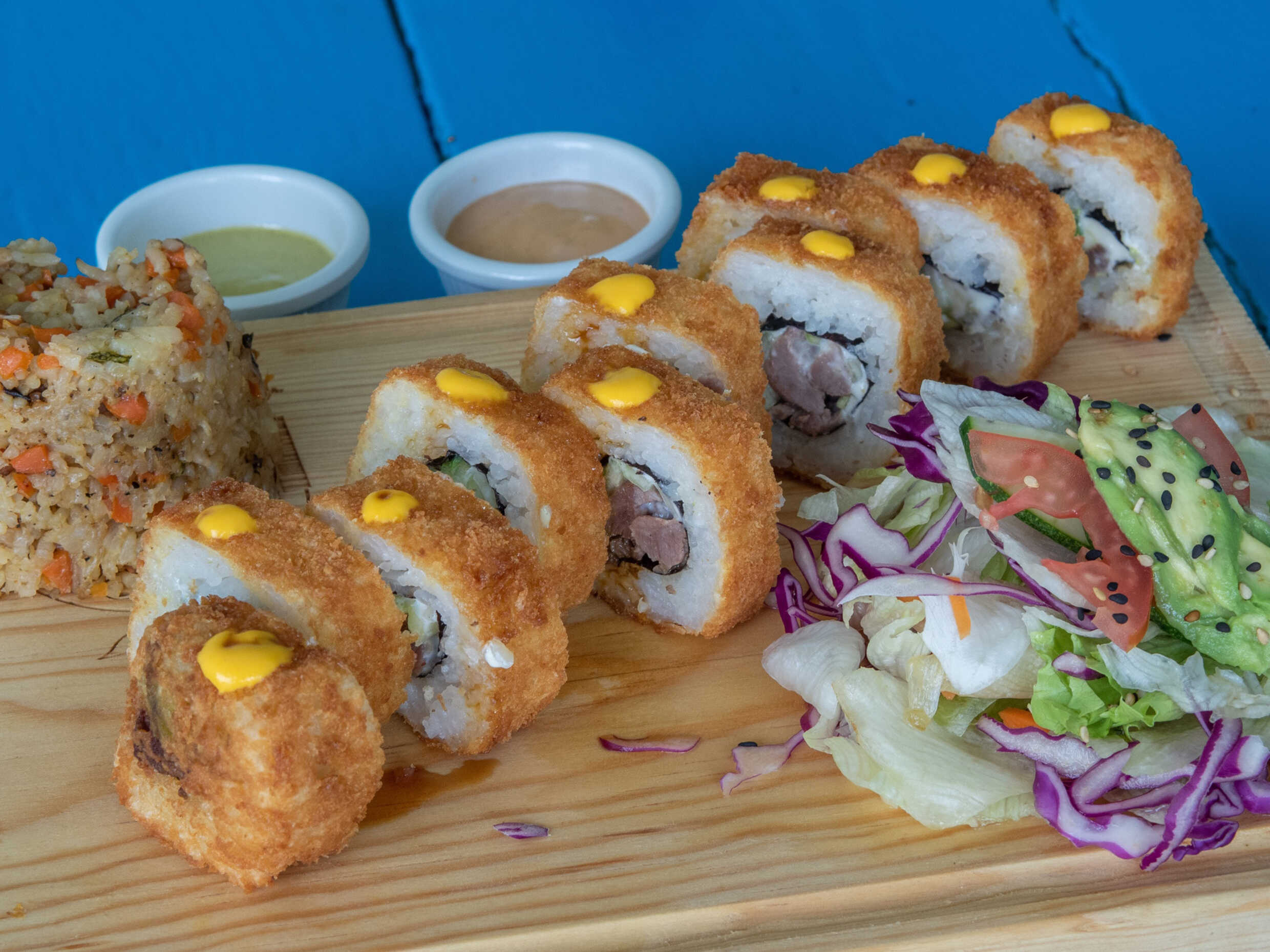 Sushi relleno de alga, pepino, aguacate, queso philadelphia y camarón con una deliciosa cama de plátano macho frito por fuera. Incluye arroz frito y ensalada como guarnición. Puedes pedirlo empanizado.