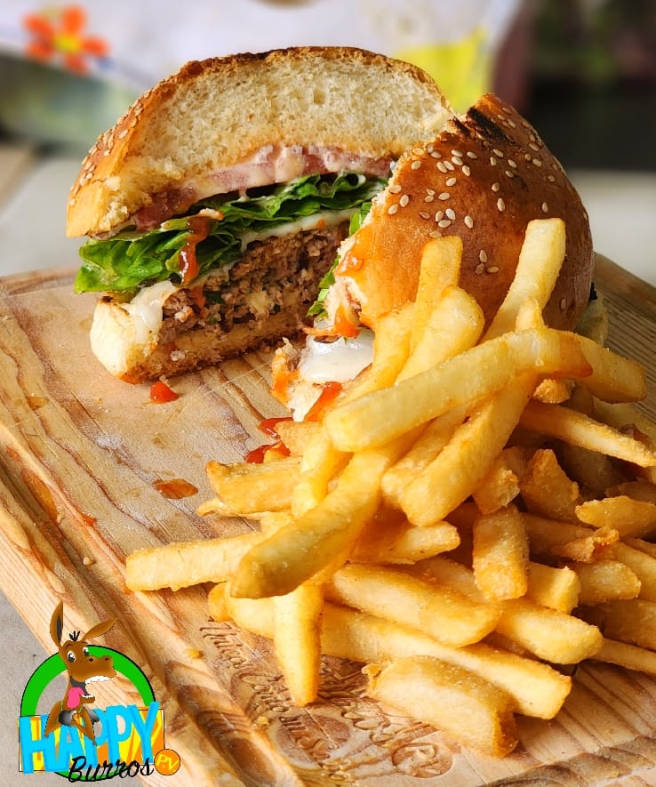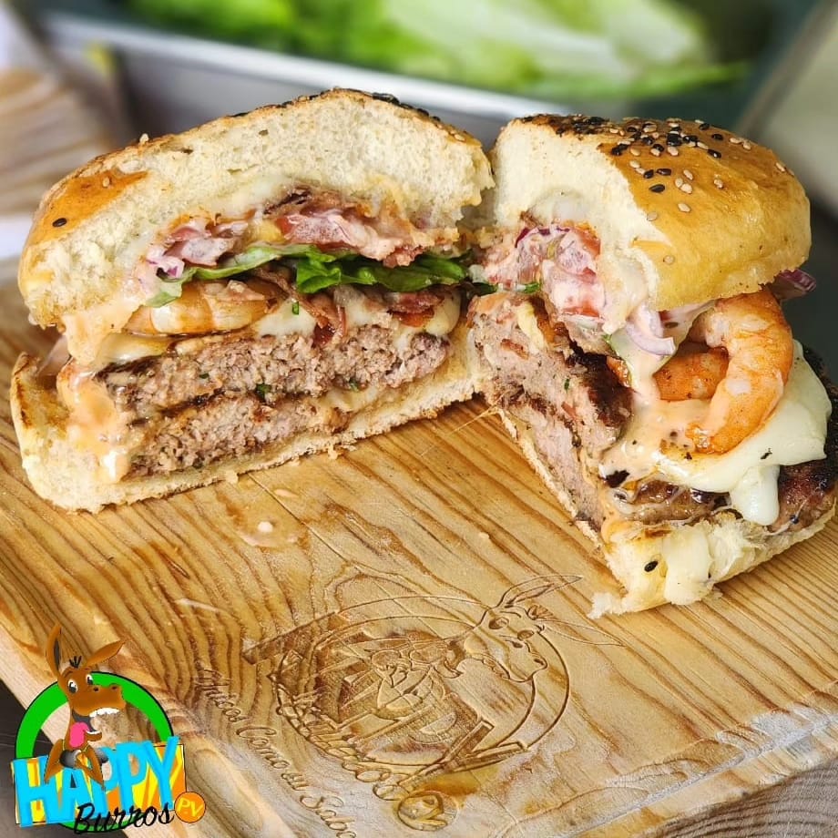 2 Piezas de 130 gramos de res angus, queso manchego, tocino, camarones, guacamole, lechuga, jitomate, cebolla y aderezo de la casa.