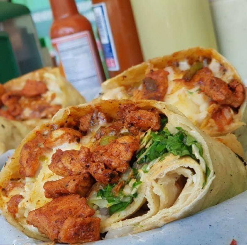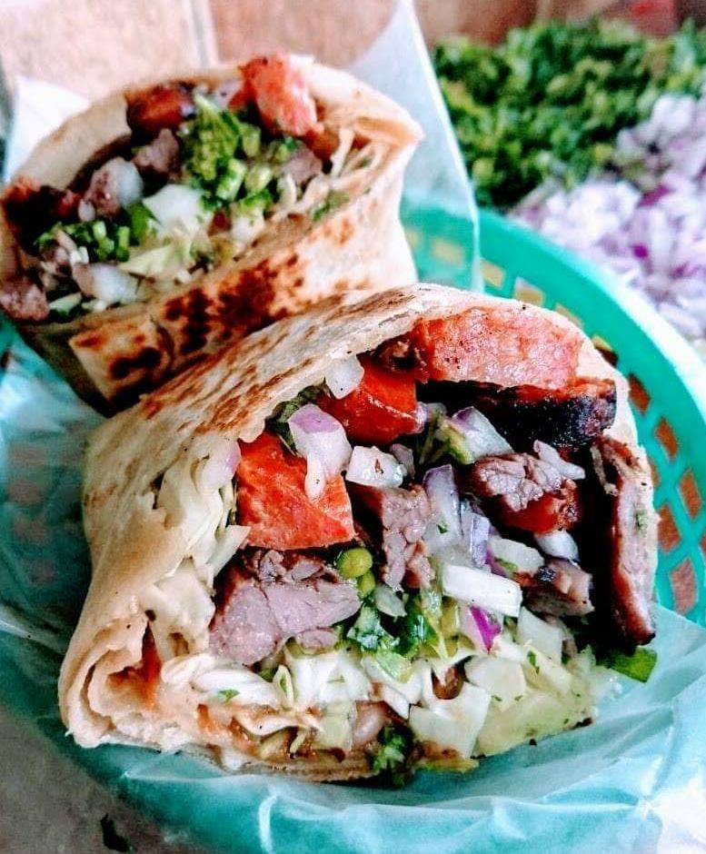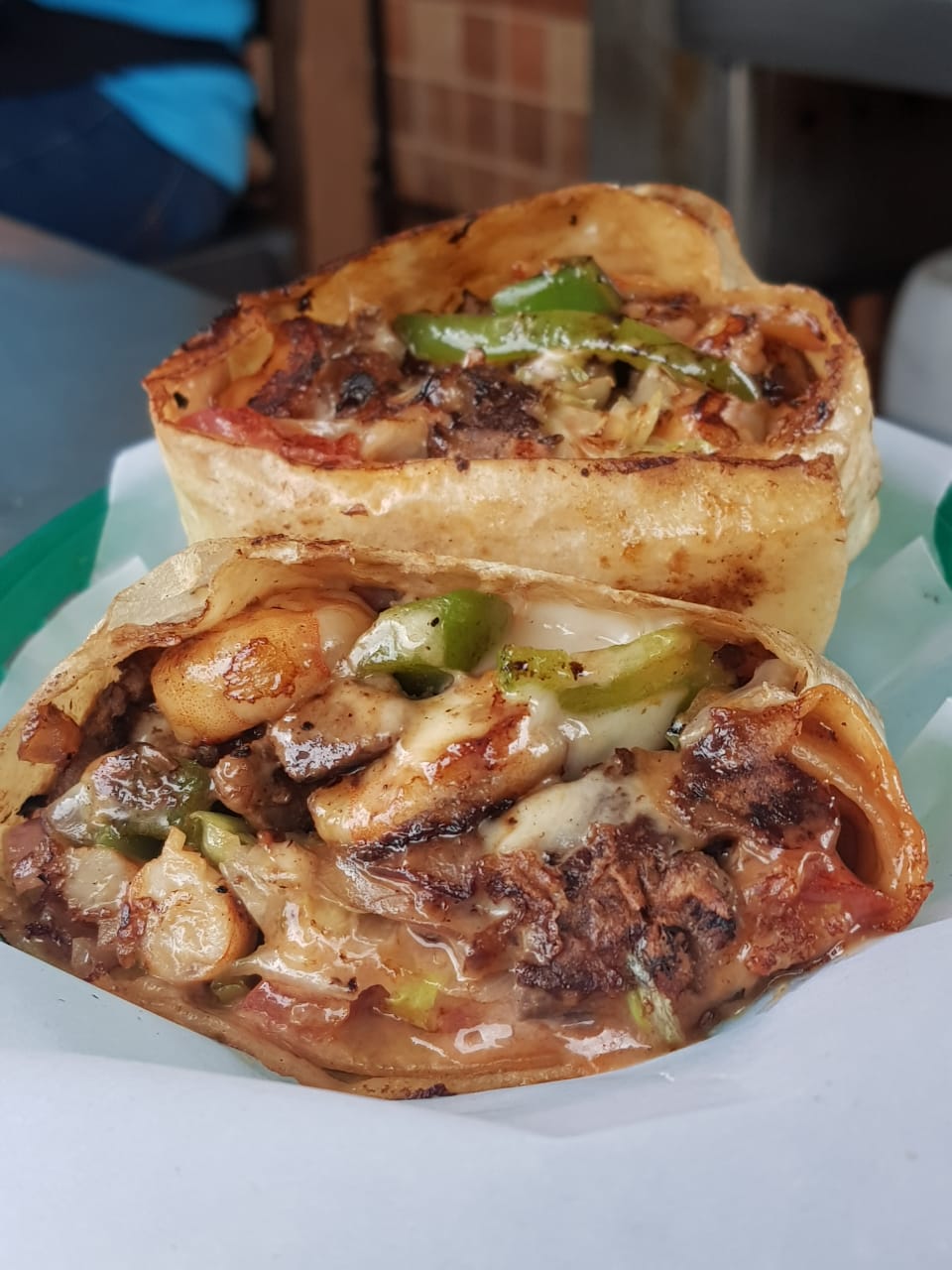 Burrito de tortilla de harina gigante relleno de fajitas de arrachera, queso gouda, chile morrón, cebolla, cilantro, col, frijoles de la olla y salsa de jitomate.