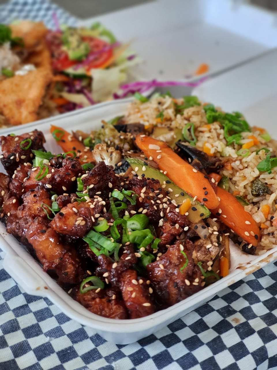 260 g De pollo a la plancha marinado con especias de la casa, pimiento morrón y zanahoria, bañados en teriyaki. Incluye arroz frito y ensalada fresca.