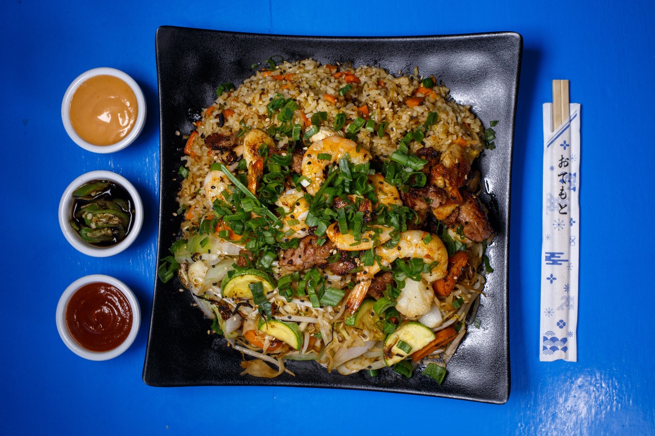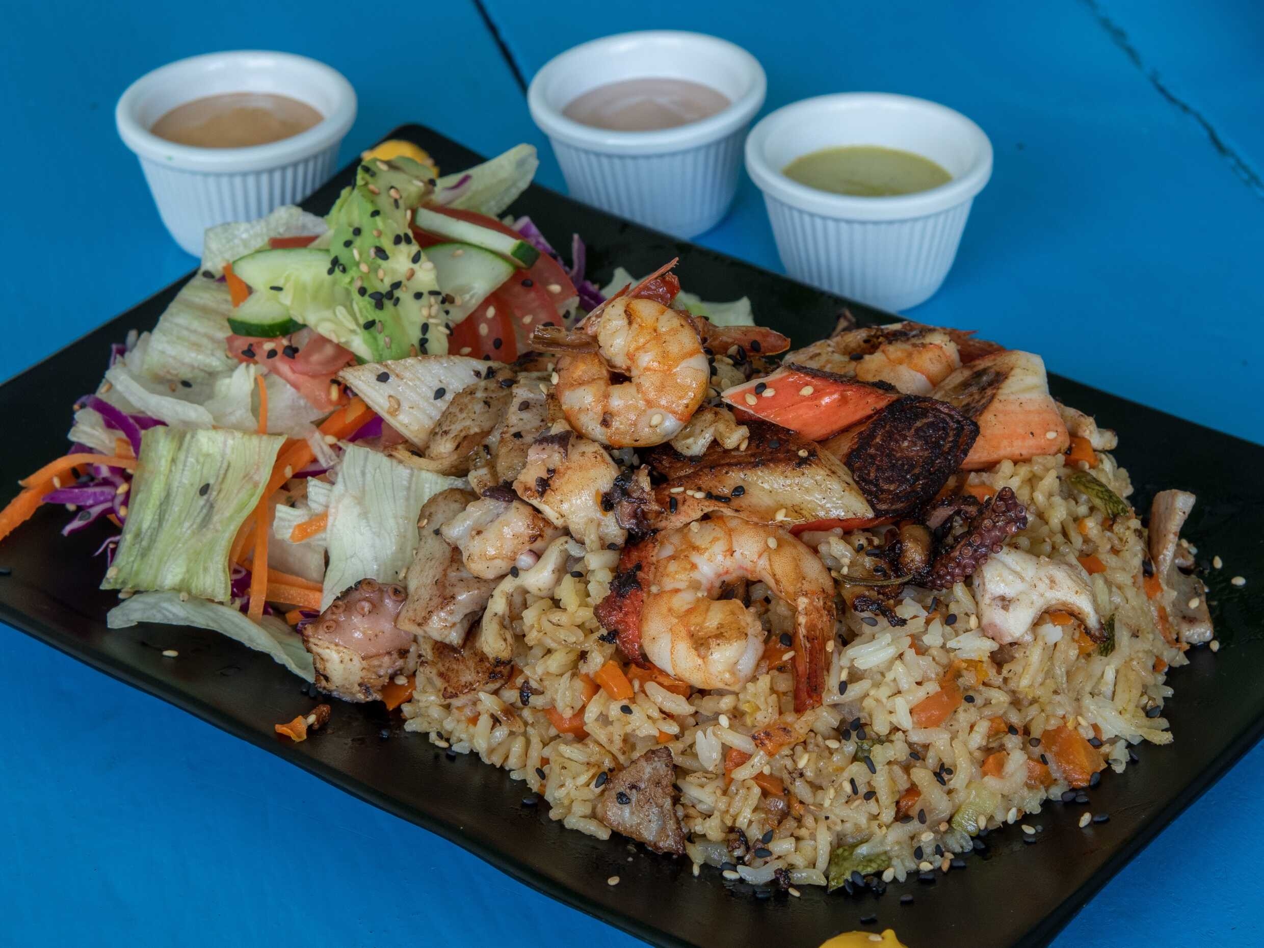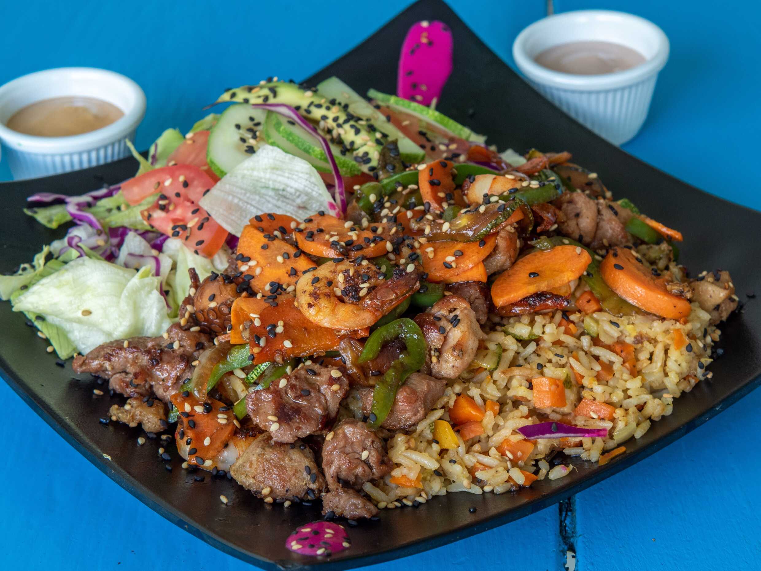 260 g De teriyaki de camarón, res y pollo con arroz frito más vegetales bañados con salsa teriyaki.