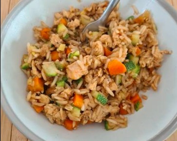 130 g De salmón sellado con 7 verduras salteadas y arroz frito.