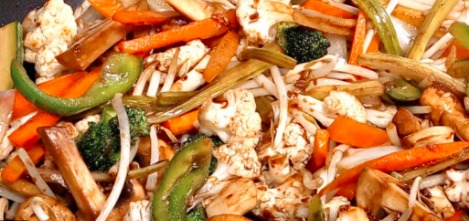 8 Tipos de verduras salteadas a la plancha con arroz frito.