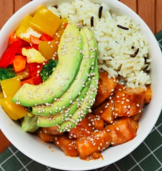 200 g De salmón sellado a la plancha con vegetales sobre una cama de arroz frito, todo bañado en salsa teriyaki.