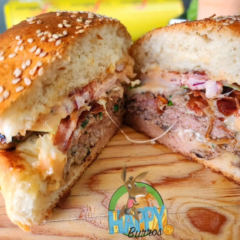 2 Piezas de 130 gramos de res angus, queso manchego, tocino, lechuga, jitomate, cebolla y aderezo de la casa.