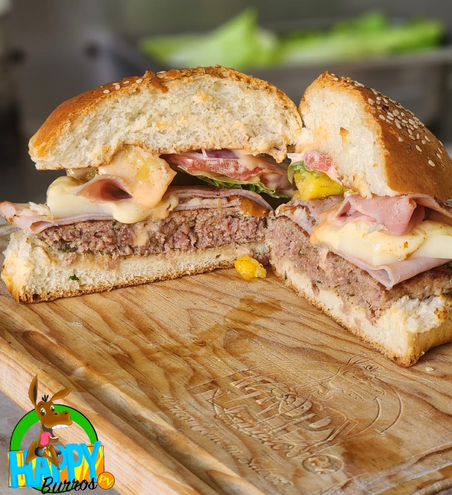 130 g De res angus, queso manchego, piña asada, jamón de pavo, lechuga, jitomate, cebolla y aderezo de la casa.