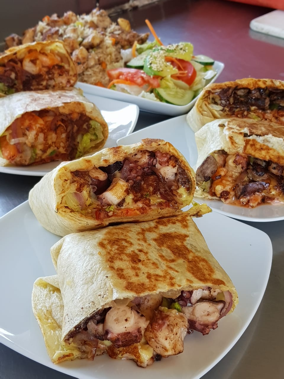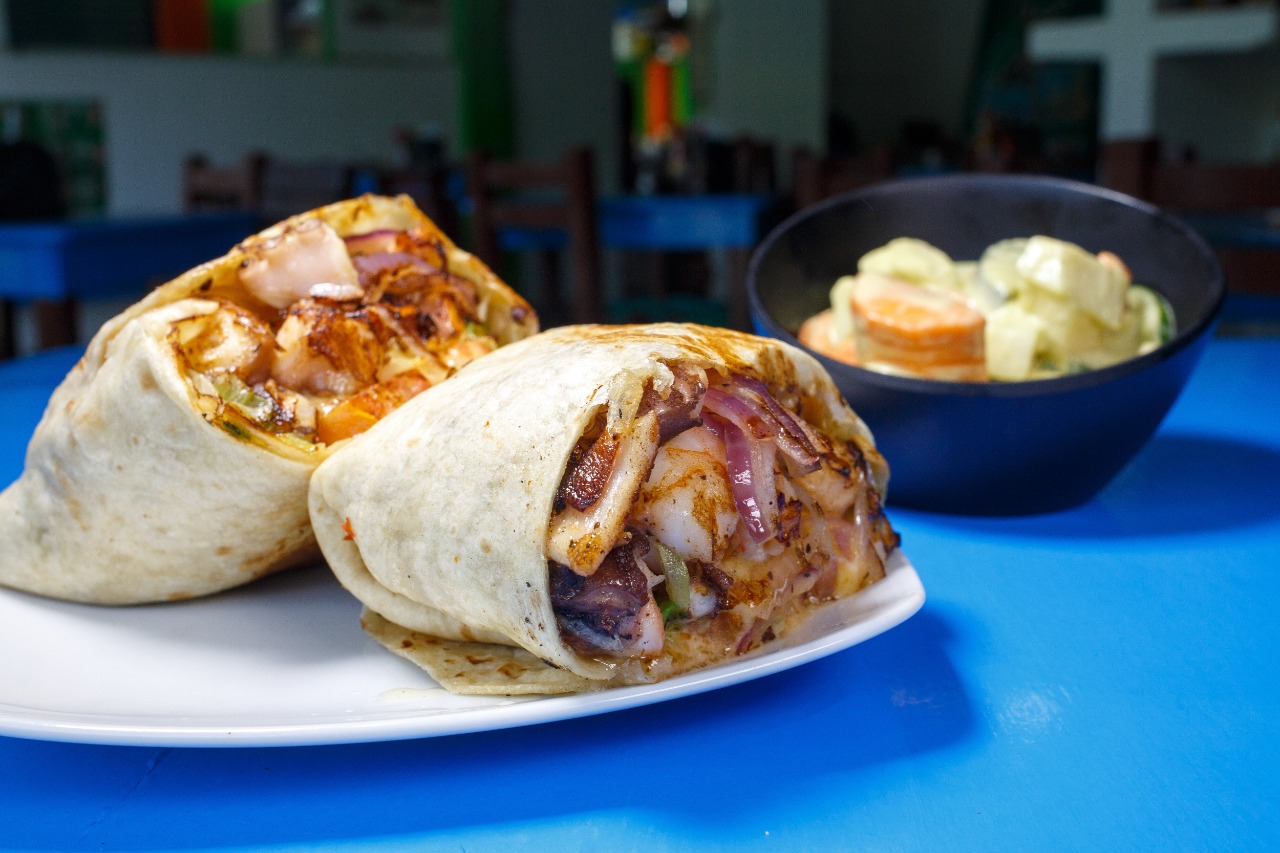 Burrito de tortilla de harina gigante relleno de camarones con pulpo al ajo, queso manchego, jitomate, cebolla salteada, lechuga, aderezo tipo ranch y salsa cátsup. Incluye una ensaladita tropical.