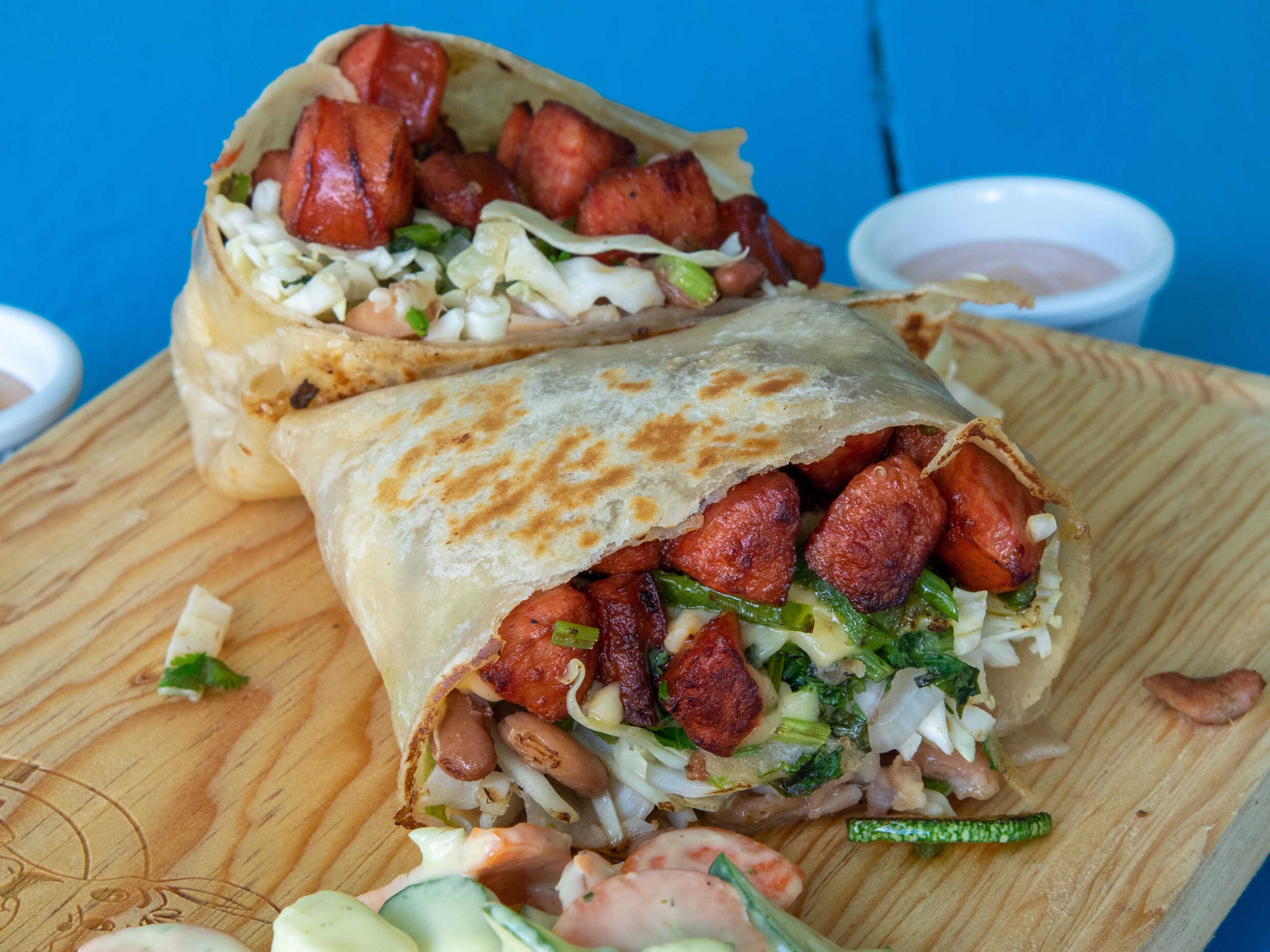 Burrita de tortilla de harina gigante rellena de camarones capeados, queso gouda, zanahoria, col, aderezo de la casa. Incluye 1 ensaladita tropical y aderezos.