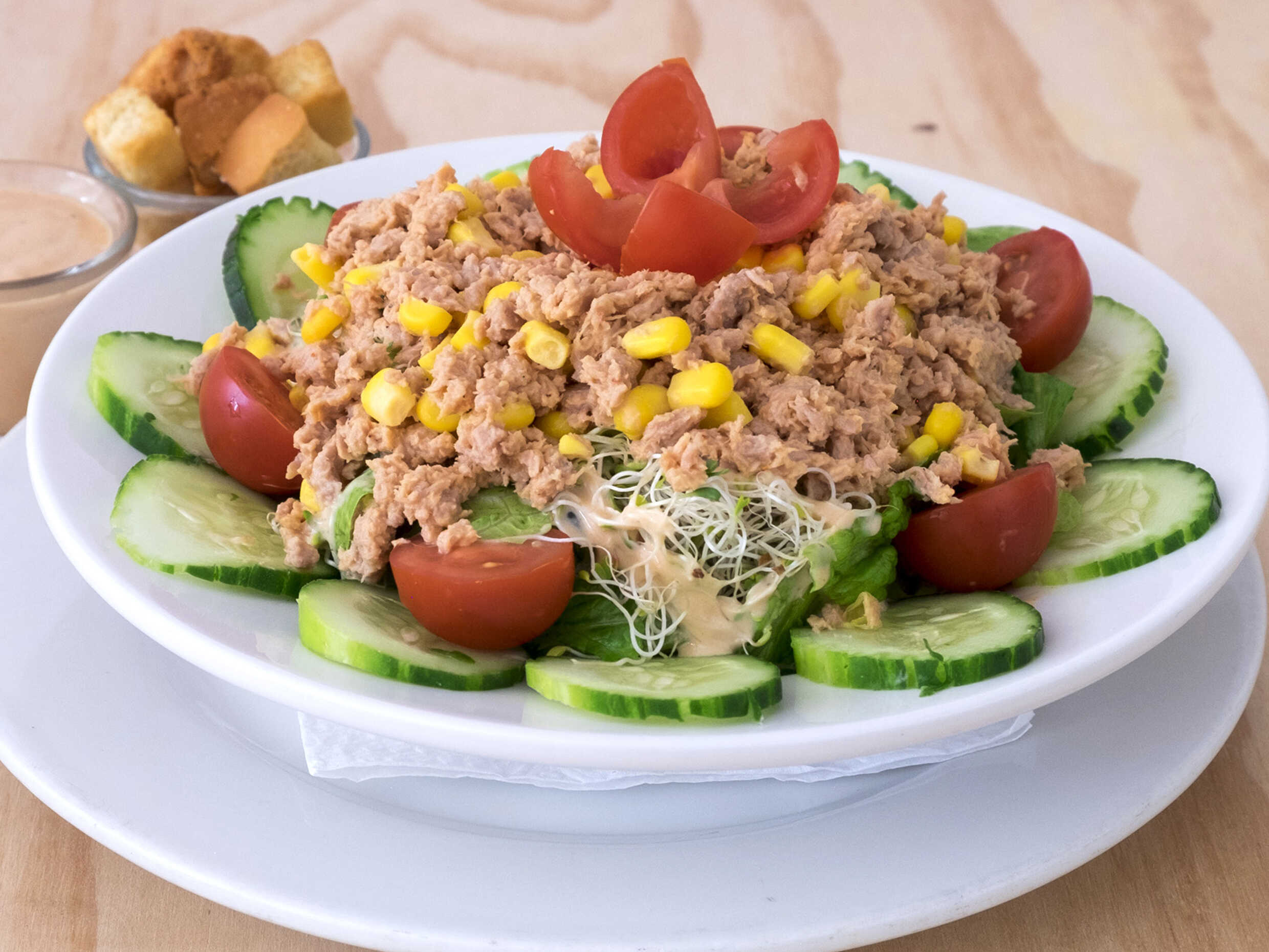 Deliciosa ensalada con lechuga orejona, 150 gr de atún en agua. Aderezada con chipotle y aderezo mil islas, pepino, elote y jitomate cherry.