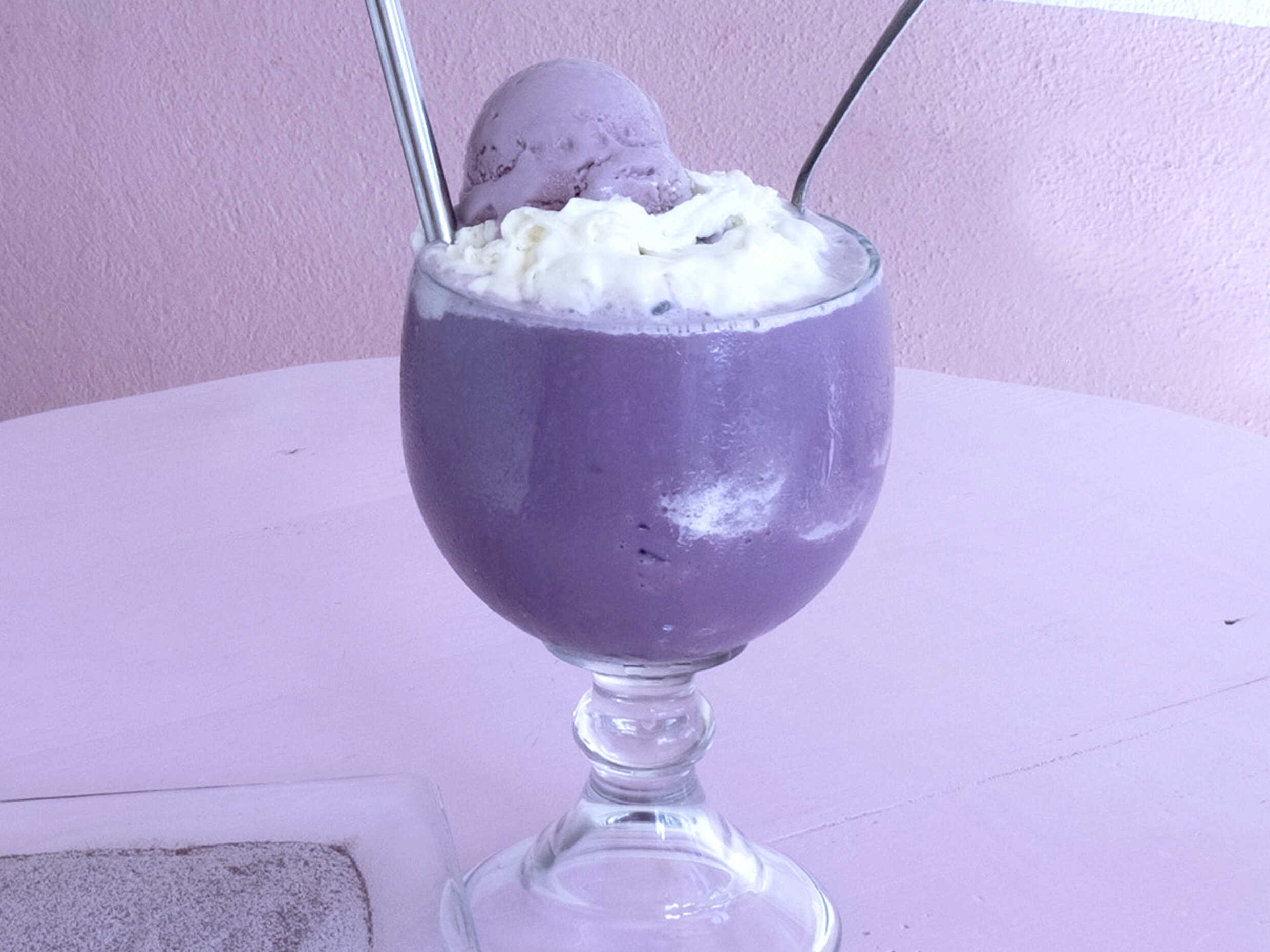 Delicioso frappé taro orgánico y crema de batida, incluye una bola de helado artesanal sabor taro.