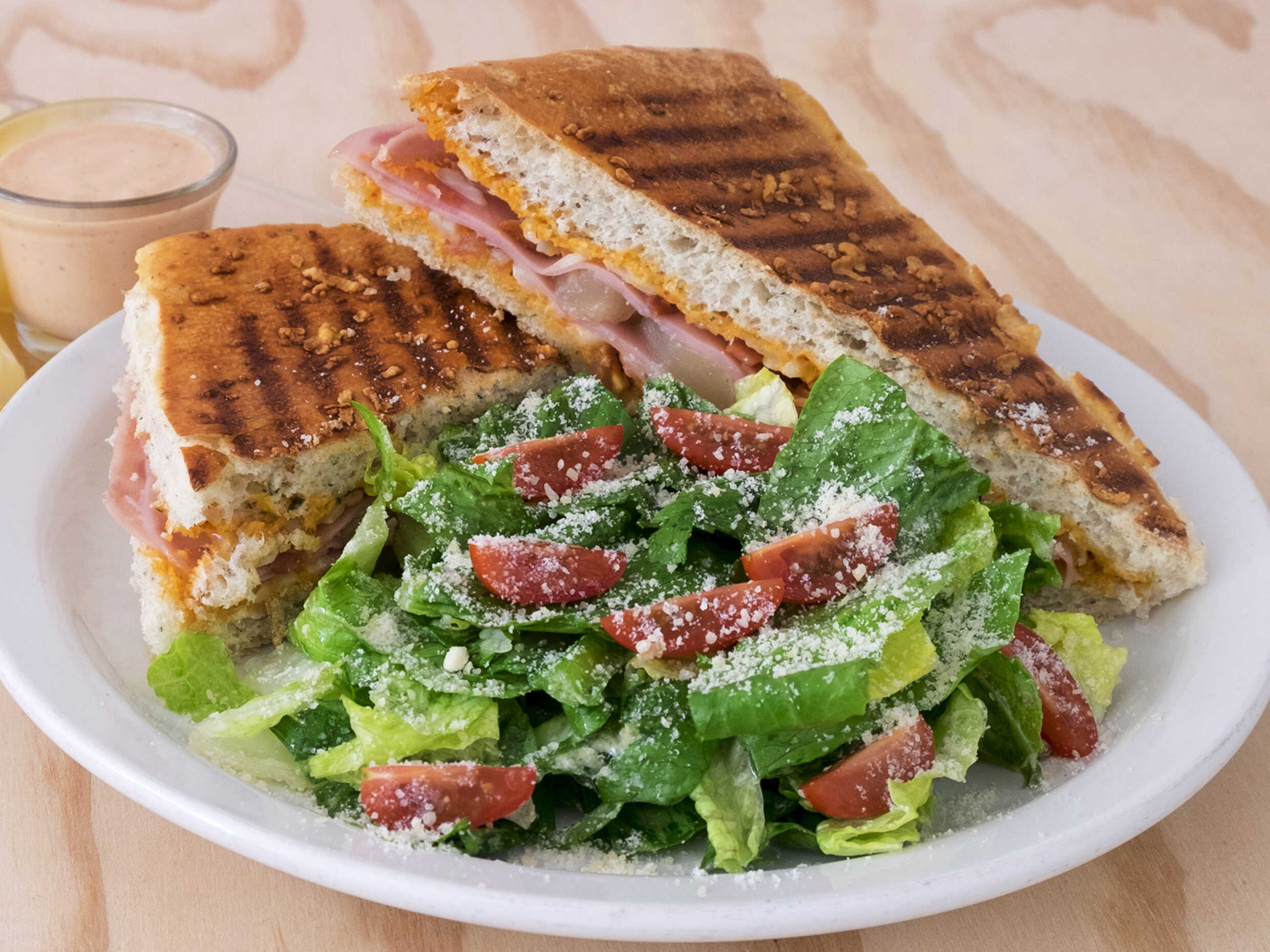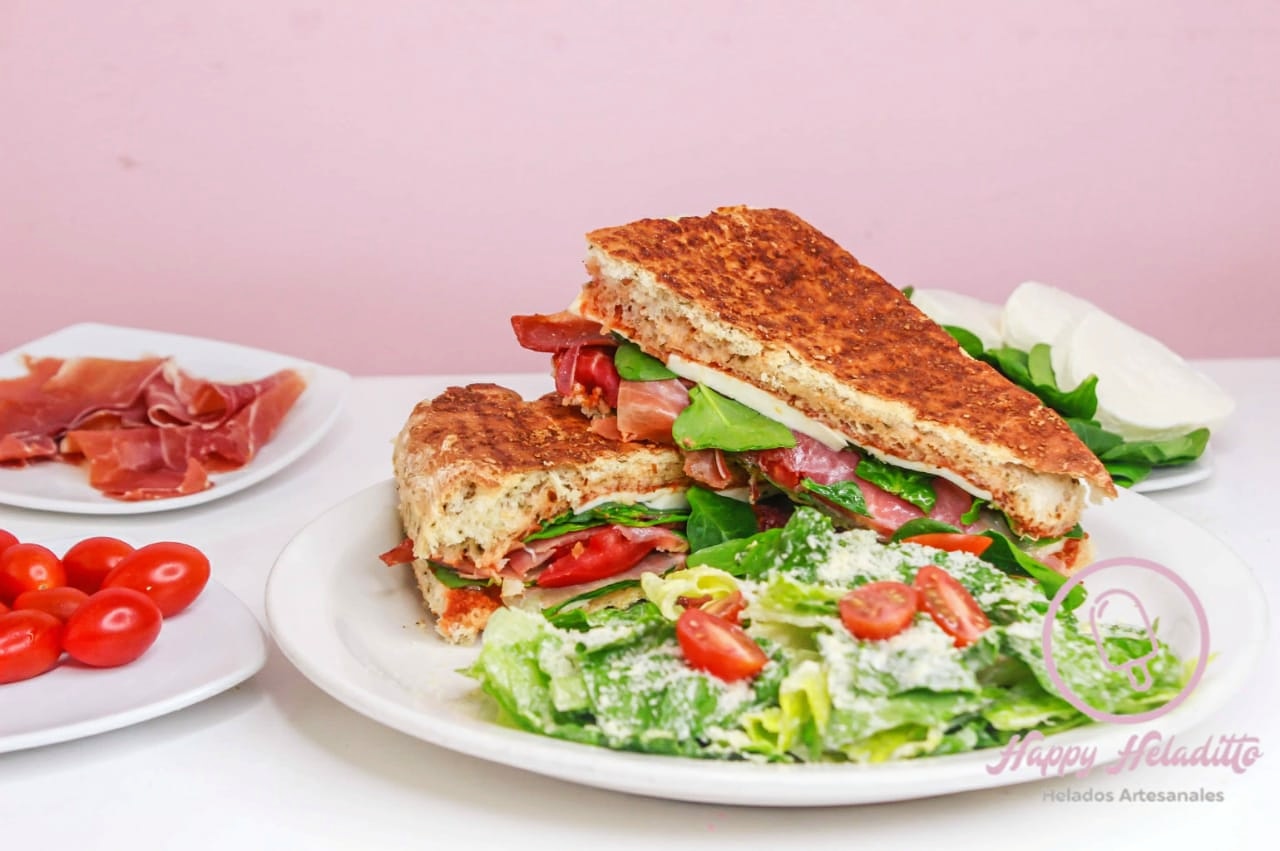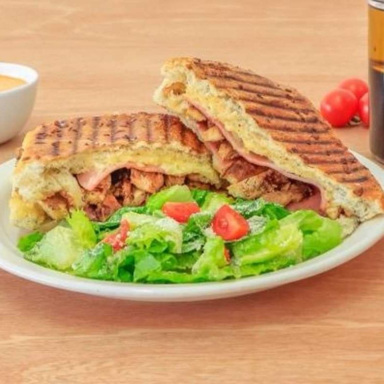 Pan ciabatta horneado a las finas hierbas con mayonesa, jamón de pavo, pechuga de pollo a la parrilla, queso manchego y salsa especial de blueberries.