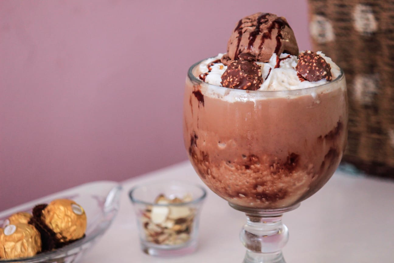 Delicioso frappé con el auténtico e irresistible Ferrero Rocher y un toque de café espresso, incluye una bola de helado artesanal sabor Ferrero Rocher.