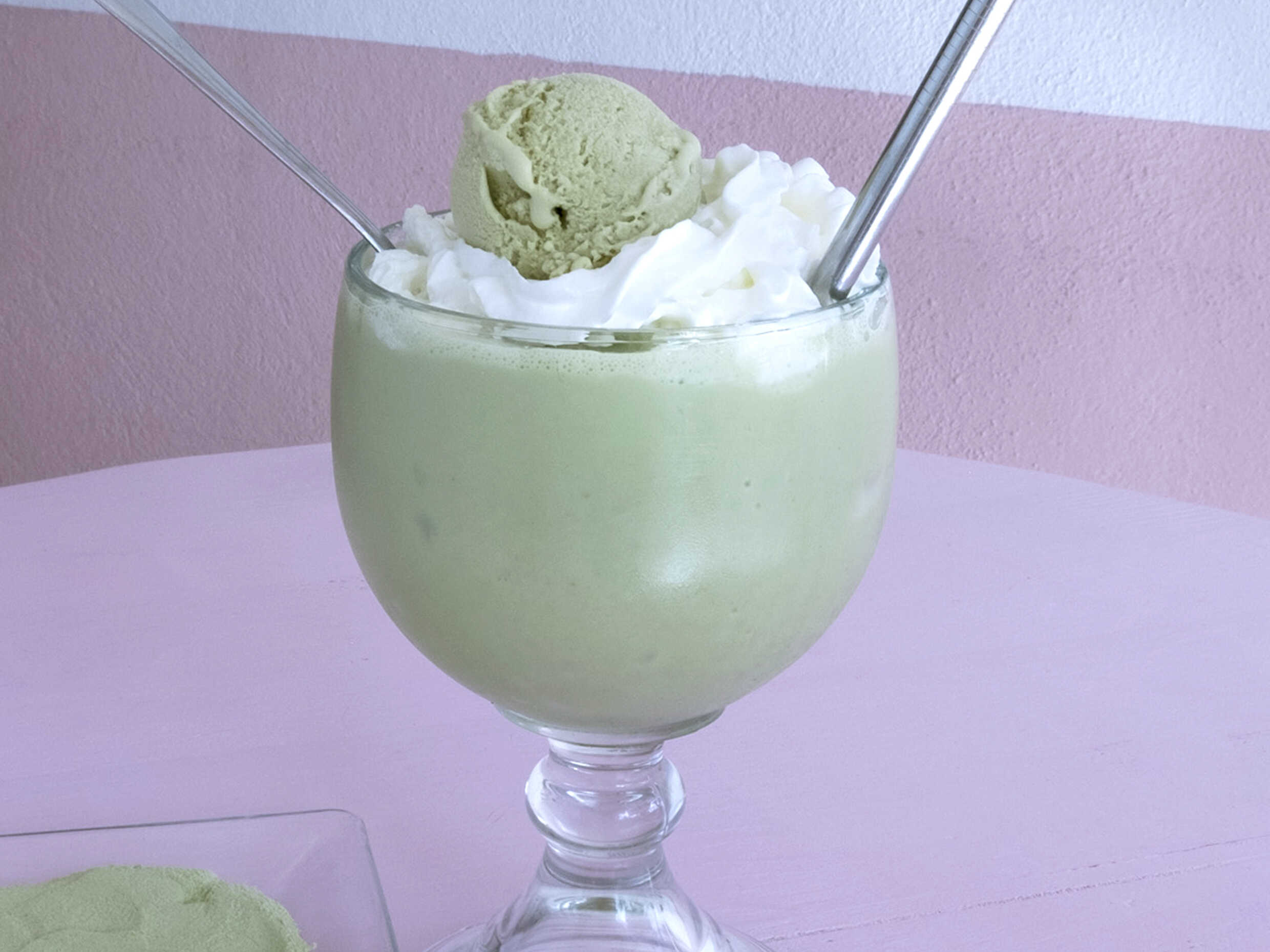 Delicioso frappé de matcha orgánico y crema de batida, incluye una bola de helado artesanal sabor matcha.