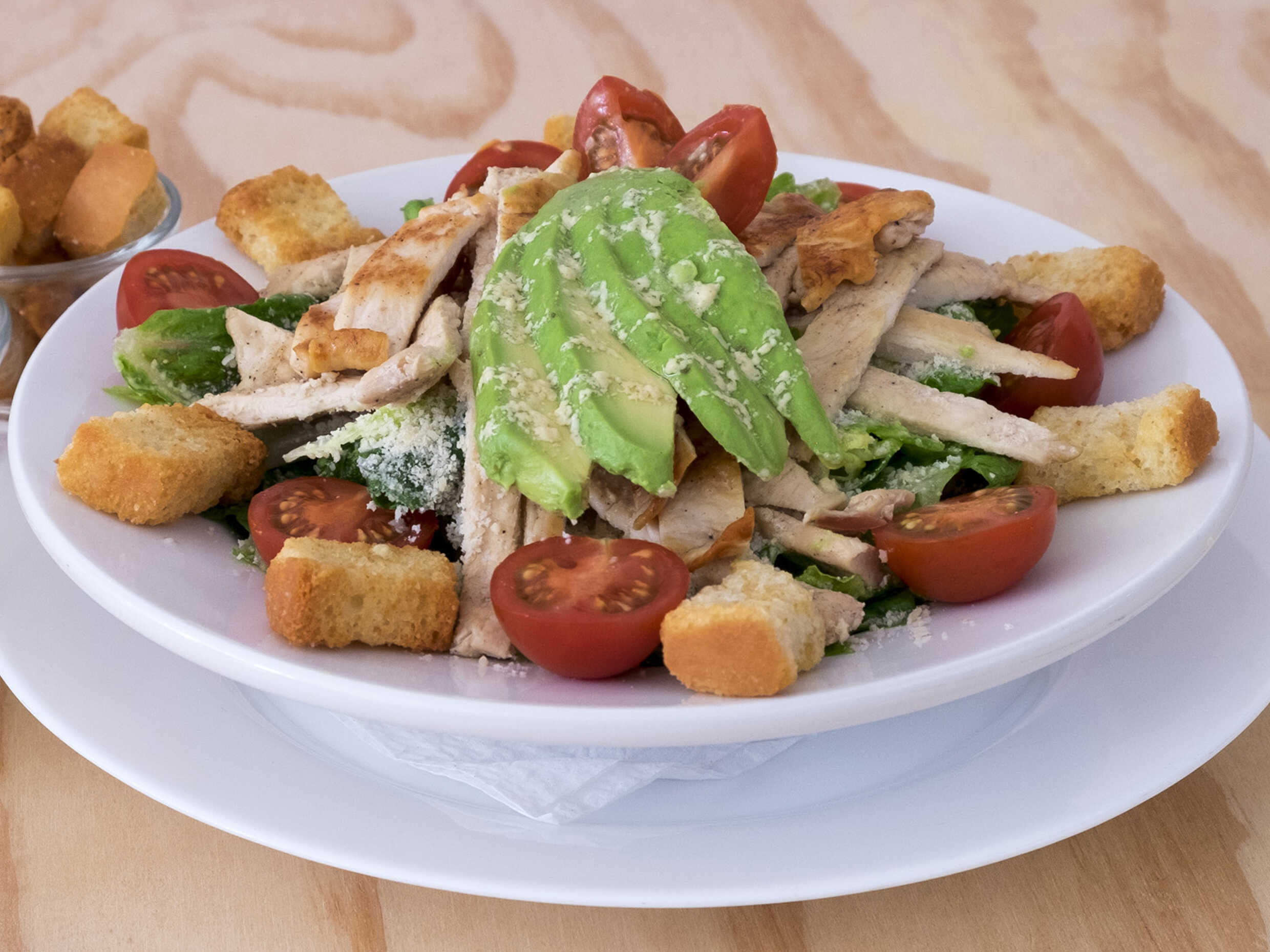 Clásica y deliciosa ensalada fresca, lechuga orejona aderezada con auténtico aderezo César hecho en casa, pechuga de pollo a la parrilla, jitomate cherry, crutones y queso parmesano.