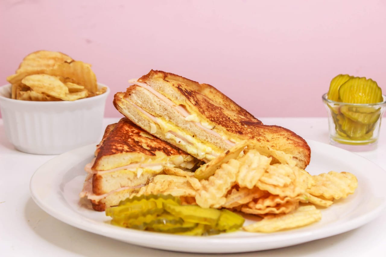 Tradicional y suculento sándwich americano/francés rebosado con huevo y leche, jamón de pavo y queso cheddar, acompañado con pepinillos y chips.