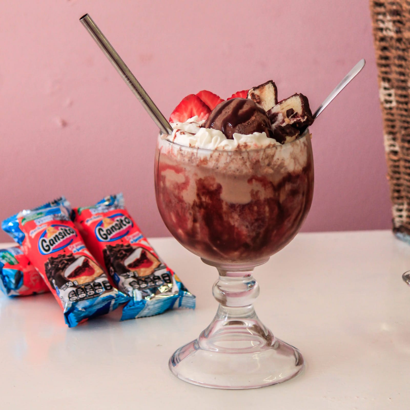 Delicioso frappé con auténtico gansito, chocolate y un toque de café espresso, incluye una bola de helado artesanal sabor chocolate amargo.