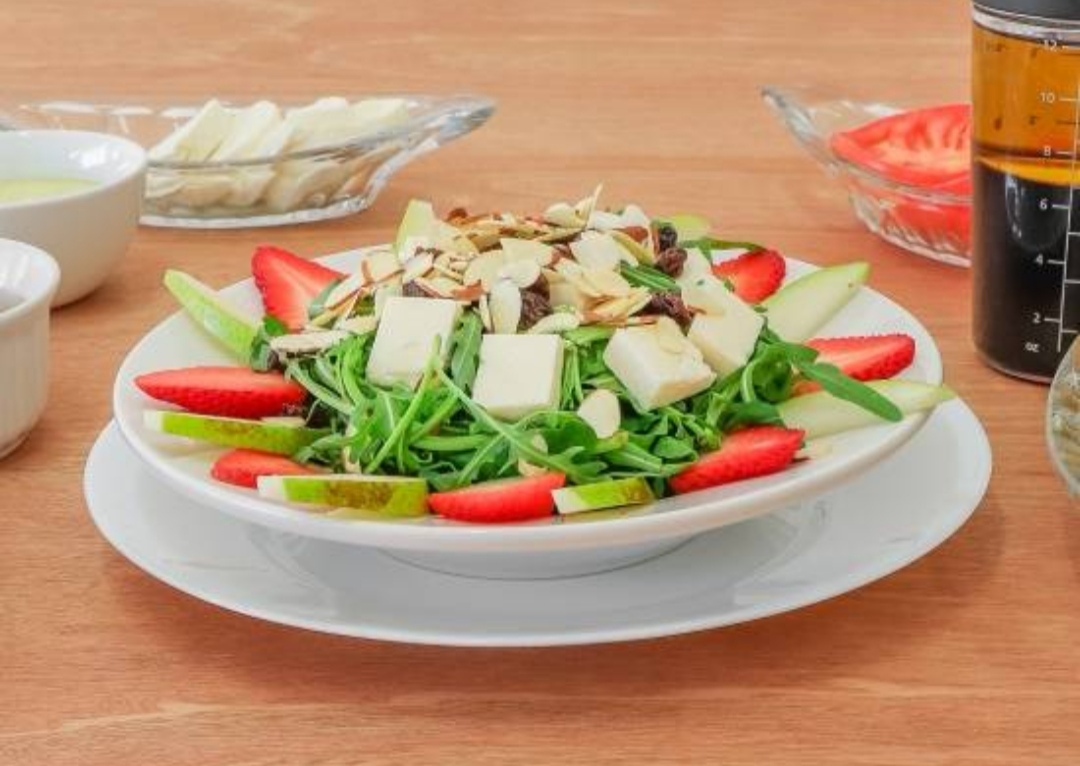Ligera y deliciosa ensalada con espinaca baby, germinado de alfalfa, fresa, queso panela, manzana, almendra y arándanos, aderezada con vinagreta balsámica, miel y cítricos.