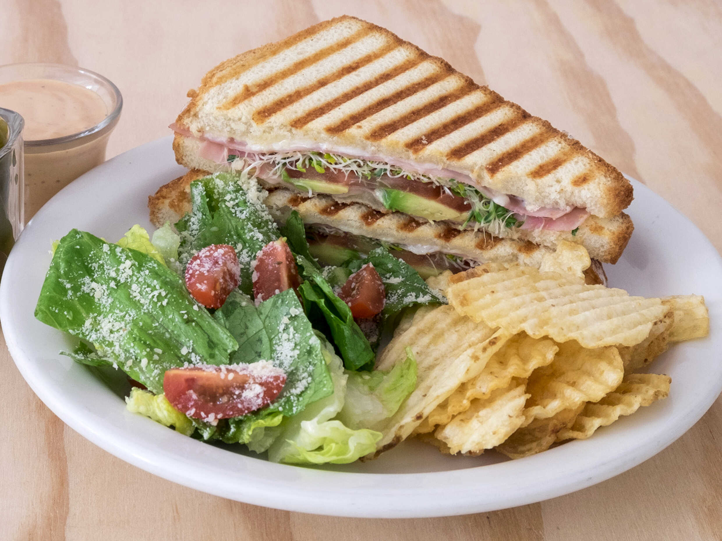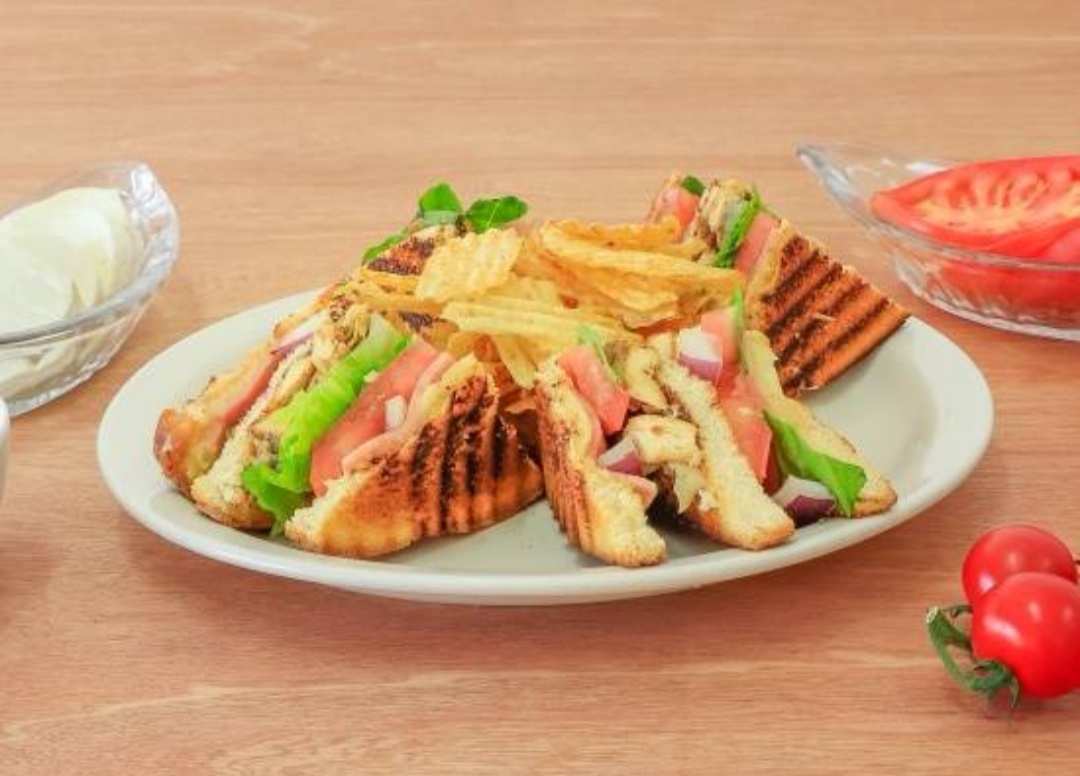 Tradicional sándwich de 3 pisos con pan, pechuga de pollo a la parrilla, jamón de pavo, queso manchego, tocino, jitomate y lechuga. Acompañado de papas fritas deshidratadas.