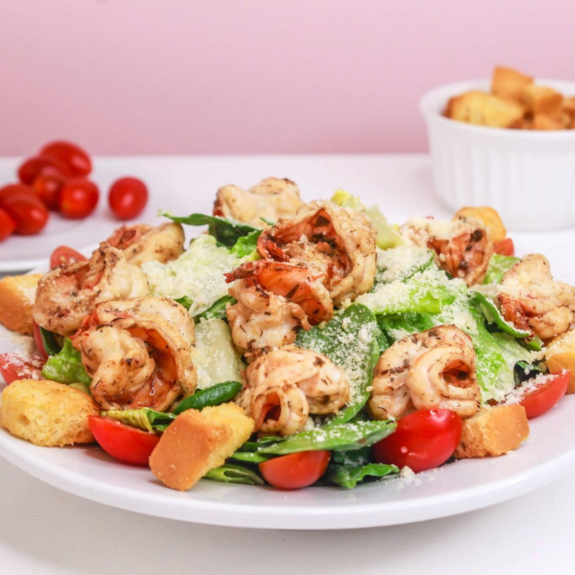Clásica y deliciosa ensalada, con fresca lechuga orejona, aderezada con auténtico aderezo César hecho en casa, camarones al ajo, jitomate cherry, crutones y queso parmesano.