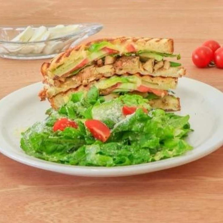 Sándwich de pan con pechuga de pollo a la parrilla, queso panela o queso manchego, gratinado de alfalfa y jitomate.
