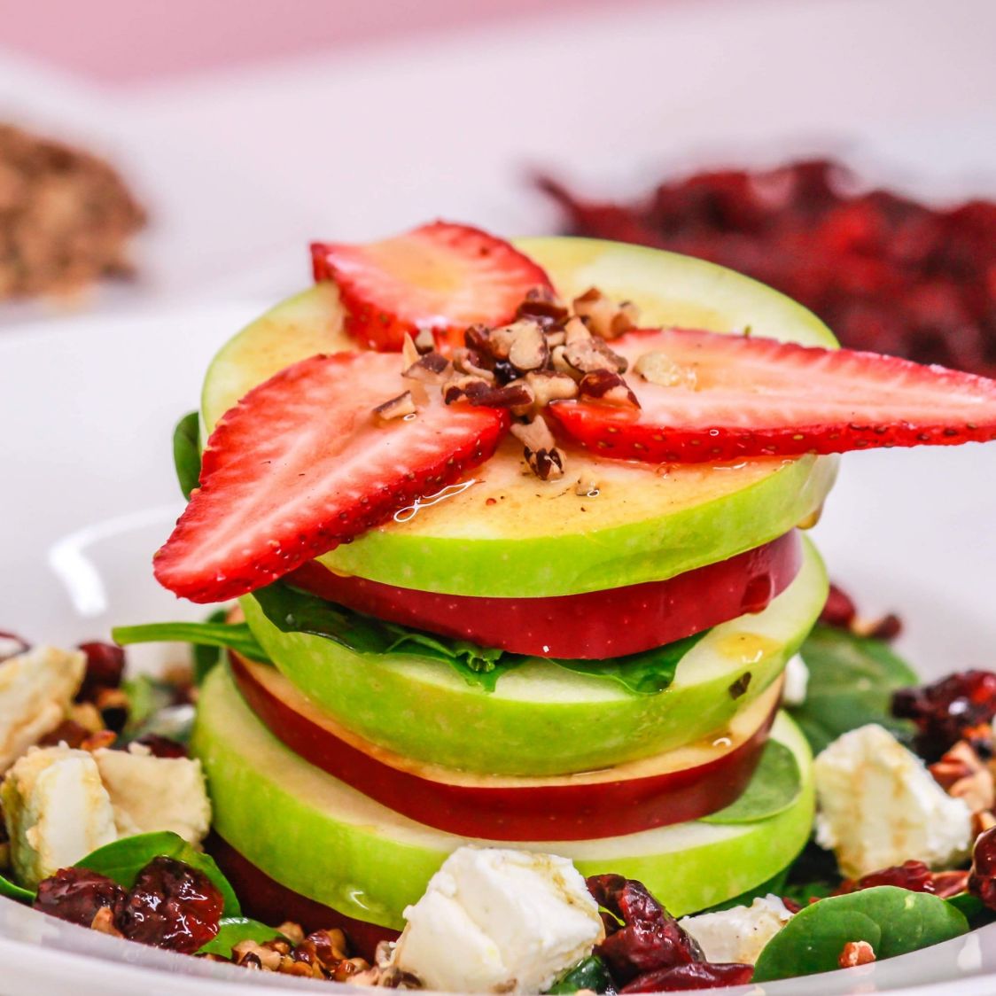 Nuestra consentida y saludable ensalada con cama de espinaca baby, rodajas de manzana verde y roja, queso de cabra, nuez tostada y arándanos, aderezada con vinagreta balsámica con cítricos.