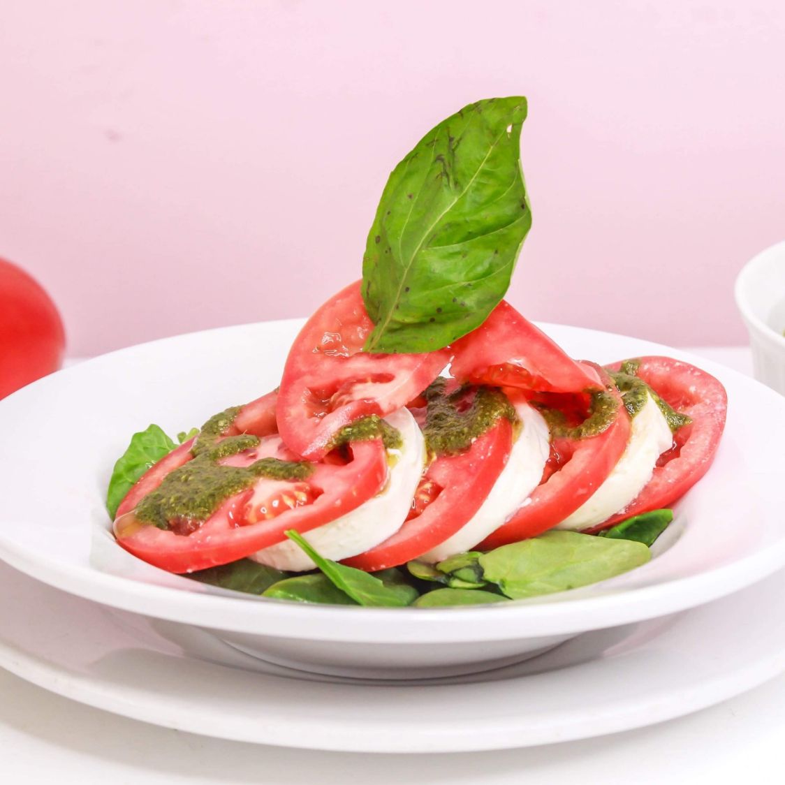 Cama de espinaca con rebanadas de jitomate fresco, queso mozzarella, bañada en nuestro delicioso pesto de albahaca.