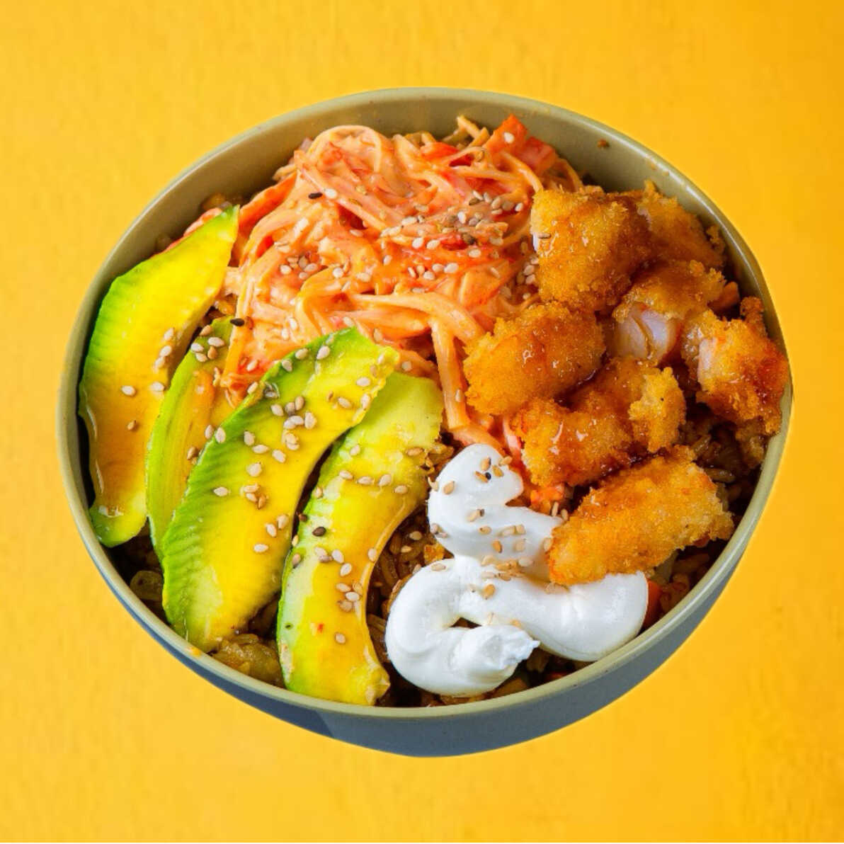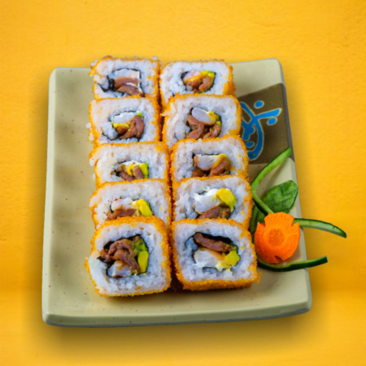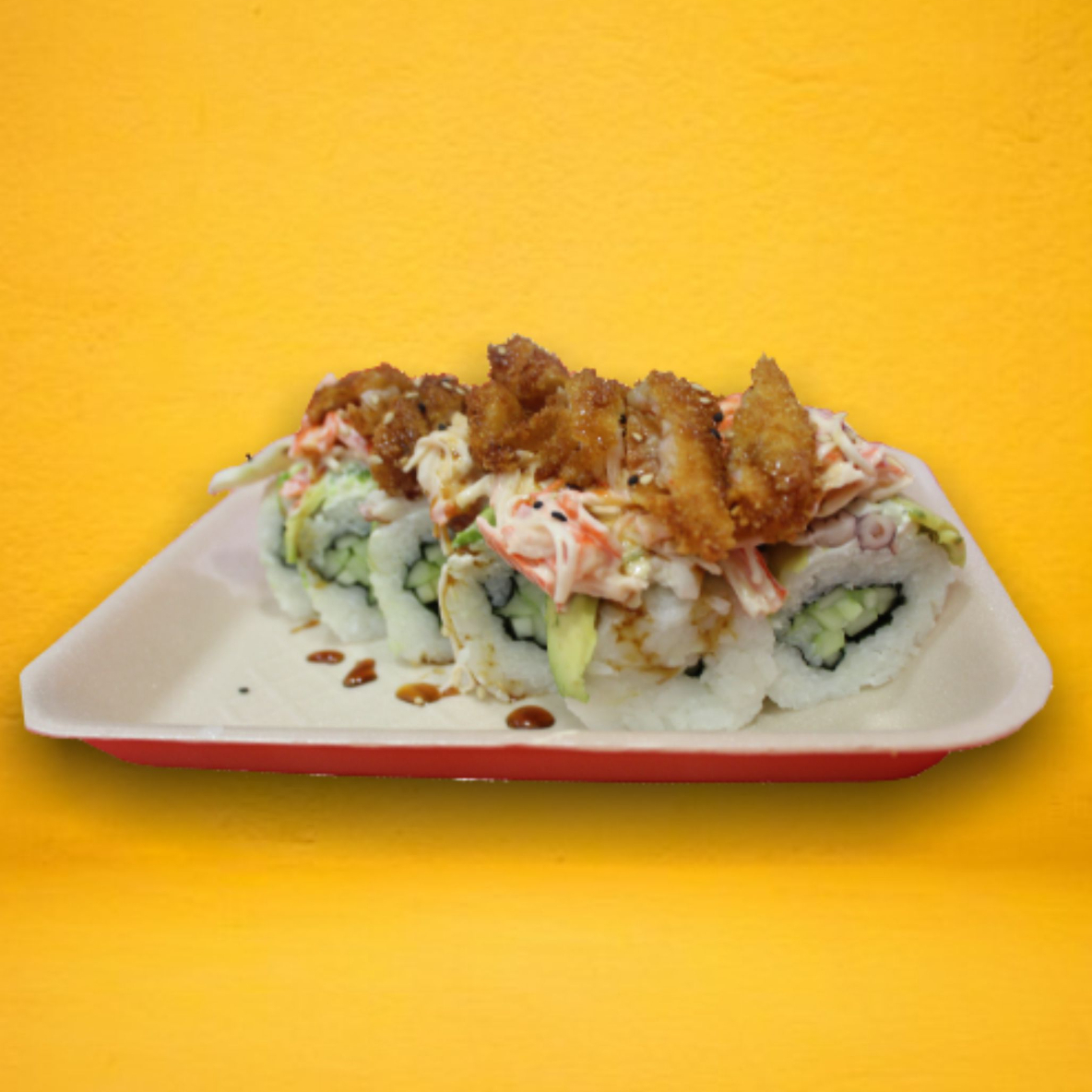 por dentro aguacate, pepino y por fuerakani, camarón empanizado y aderezo especial 300g