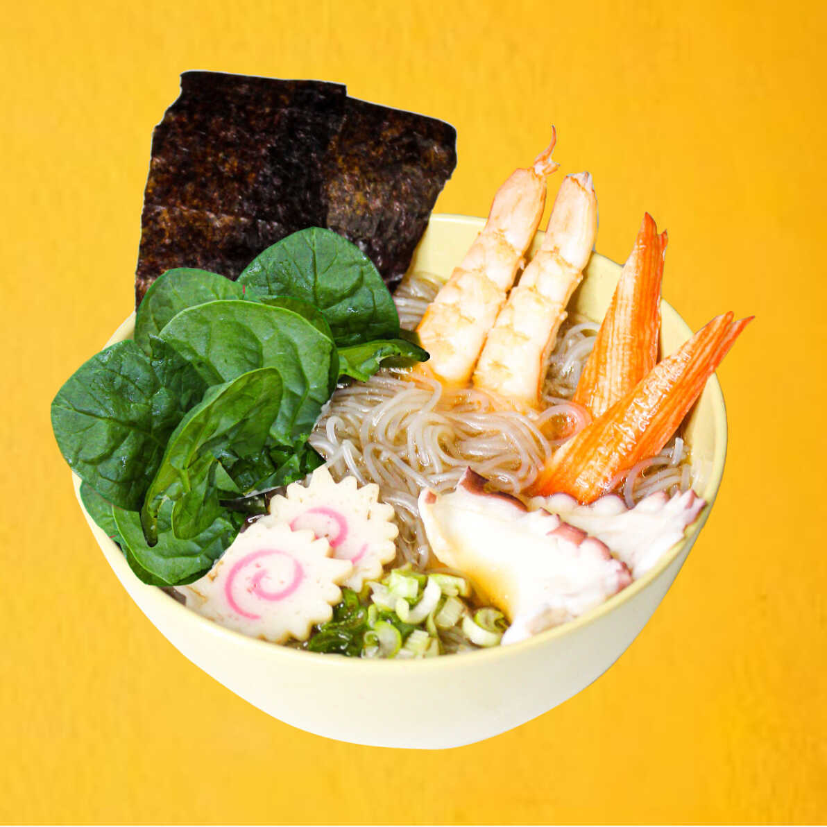 RAMEN SOPA DE FIDEO DE MARISCOS 600G caldo a base de soya, naruto, 2 camarones, surimi, cebollin, espinaca y pulpo.