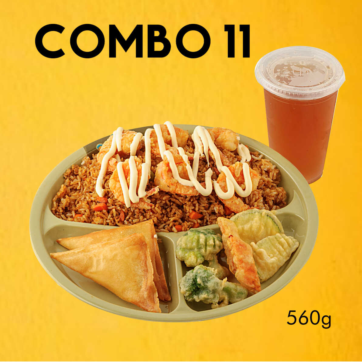 yakimeshi de camarón con aderezo especial, 2 dumplings, verdura tempura, escoge tu bebida favorita.