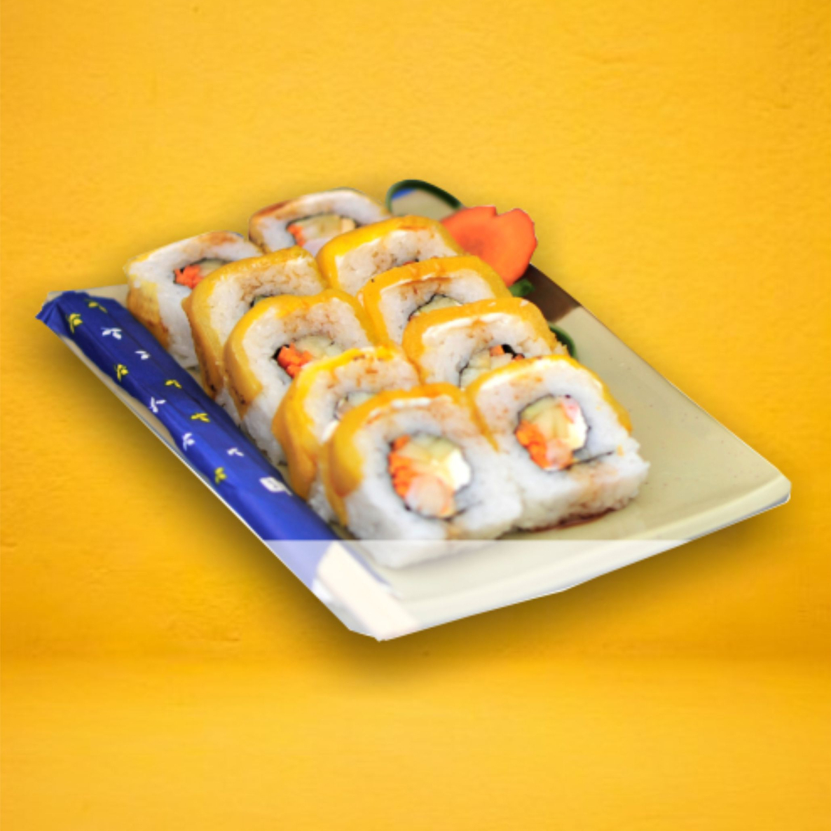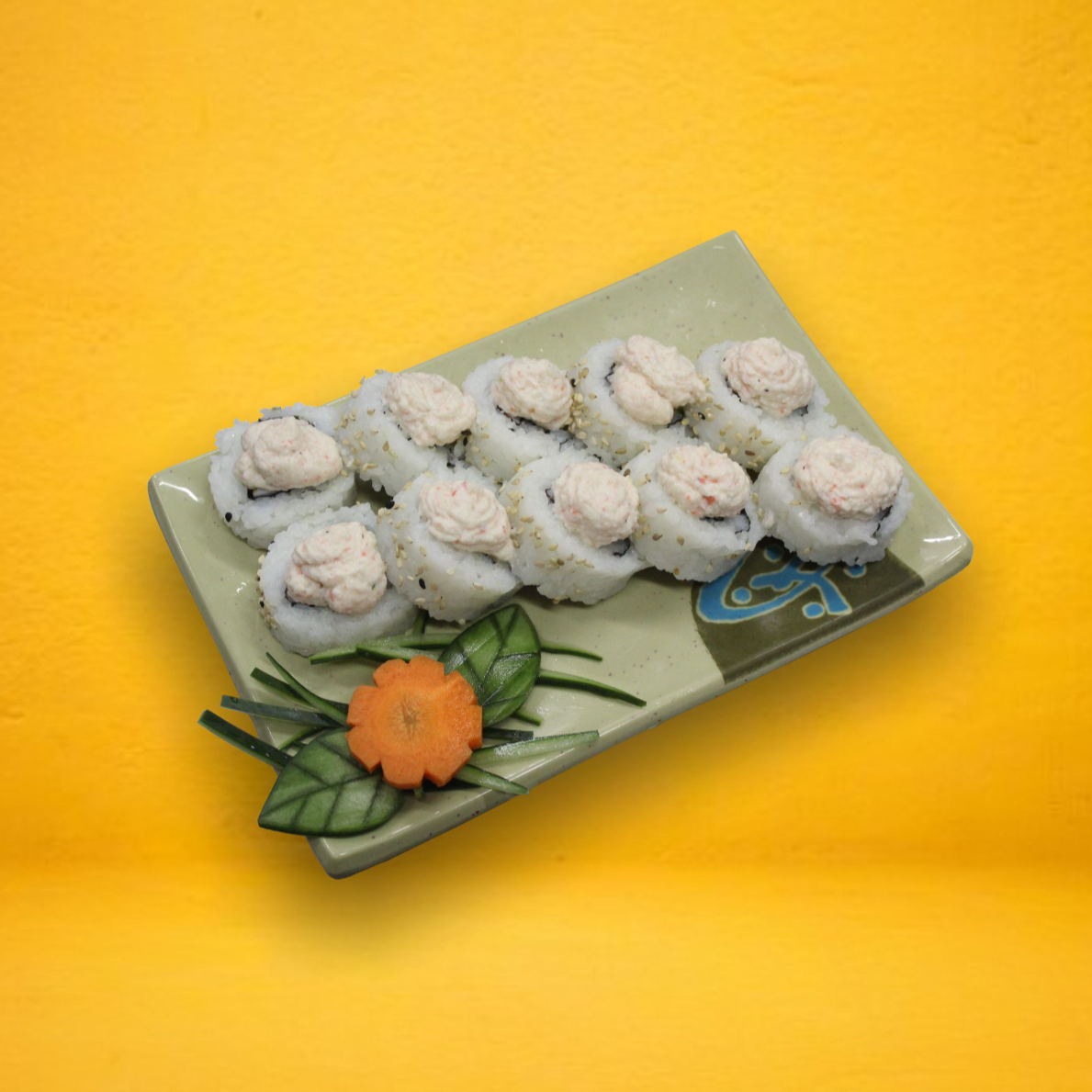 por dentro pepino, surimi y por fuera queso, aguacate, camarón, masago y chipotle 300g