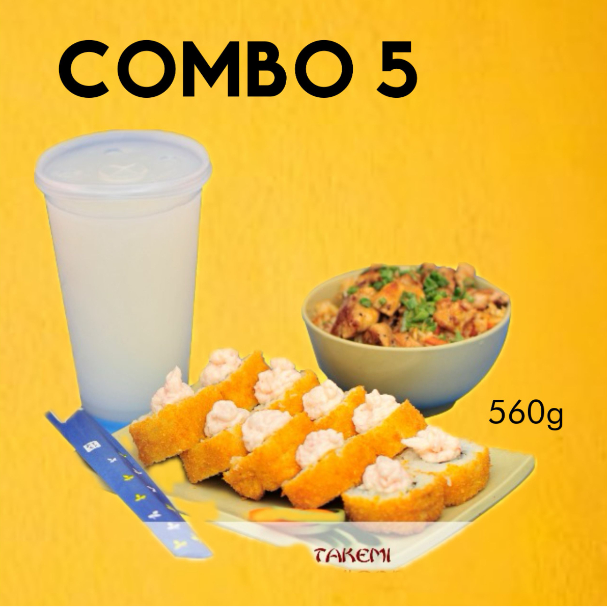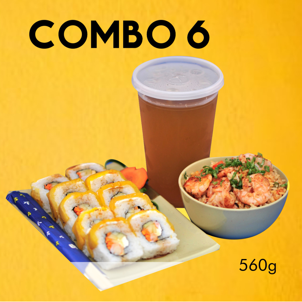 Sushi nevado, yakimeshi de camarón y salsa calpico, escoge tu bebida favorita.