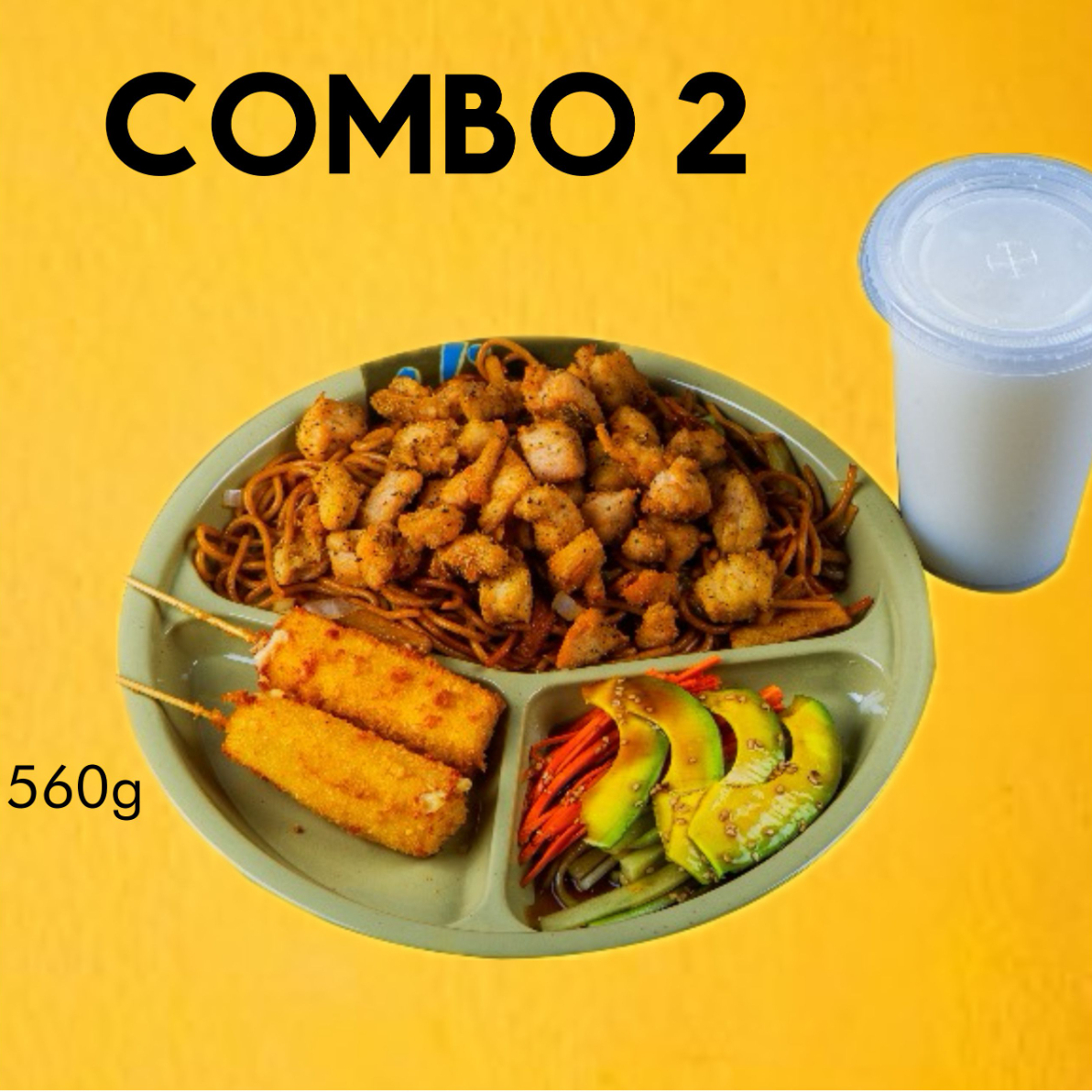 Espagueti, pollo frito , ensalada, 2 brochetas de queso, escoge tu bebida favorita