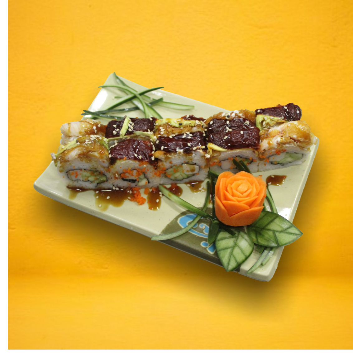 por dentro pepino, aguacate y por fuera queso, kani empanizado, camarón y ensalada kani, trocintos de pulpo y twts de limón, salsa anguila y shirasha 300g