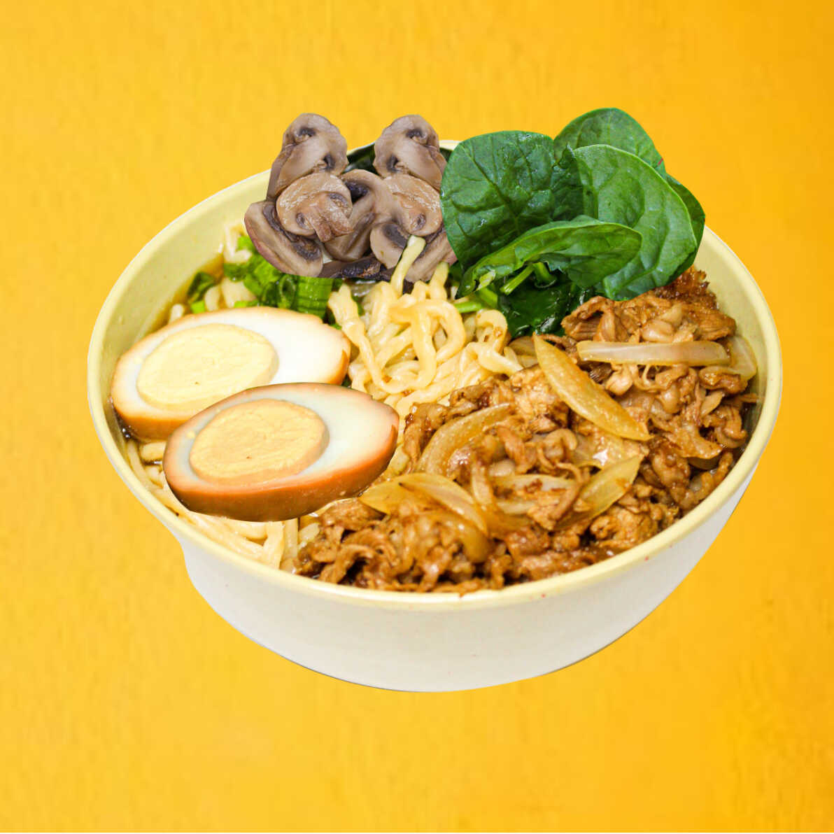 RAMEN CON CARNE DE RES 550G con caldo miso, 1 huevo, res, espinaca, champiñones y cebollin.